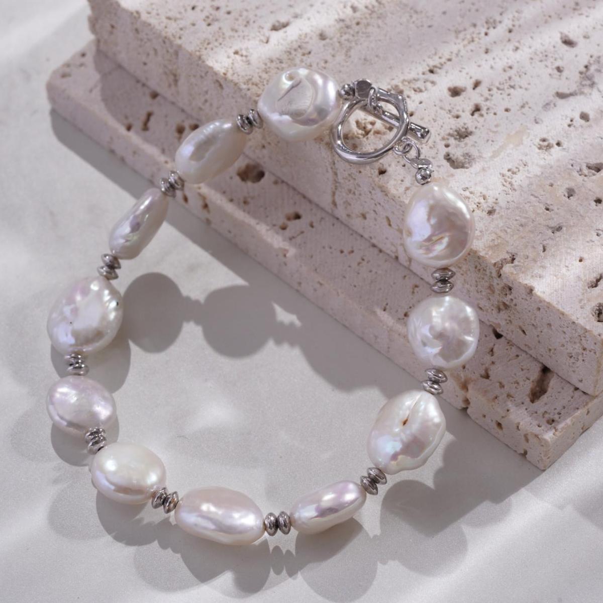 This bracelet features a well-defined material composition, combining S925 sterling silver with creamy white natural freshwater pearls. Irregularly shaped oval pearls are uniformly strung along the band, each separated by a thin S925 silver spacer that distinctly defines every pearl’s individual placement. Each pearl showcases its naturally occurring micro-textures, creating a subtle contrast between the organic tactility of the pearls and the cool, metallic sheen of the silver. This interplay delivers a harmonious blend of natural warmth and contemporary metallic elegance.