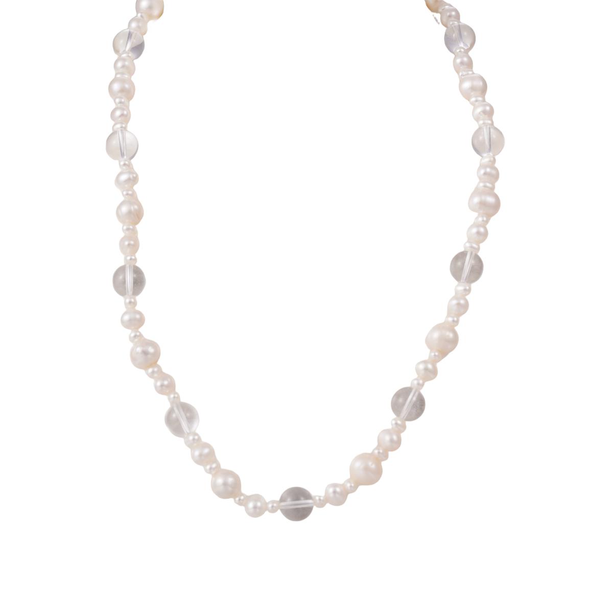 Design & Materials: This necklace alternates between natural freshwater pearls and transparent crystal beads. The pearls are...