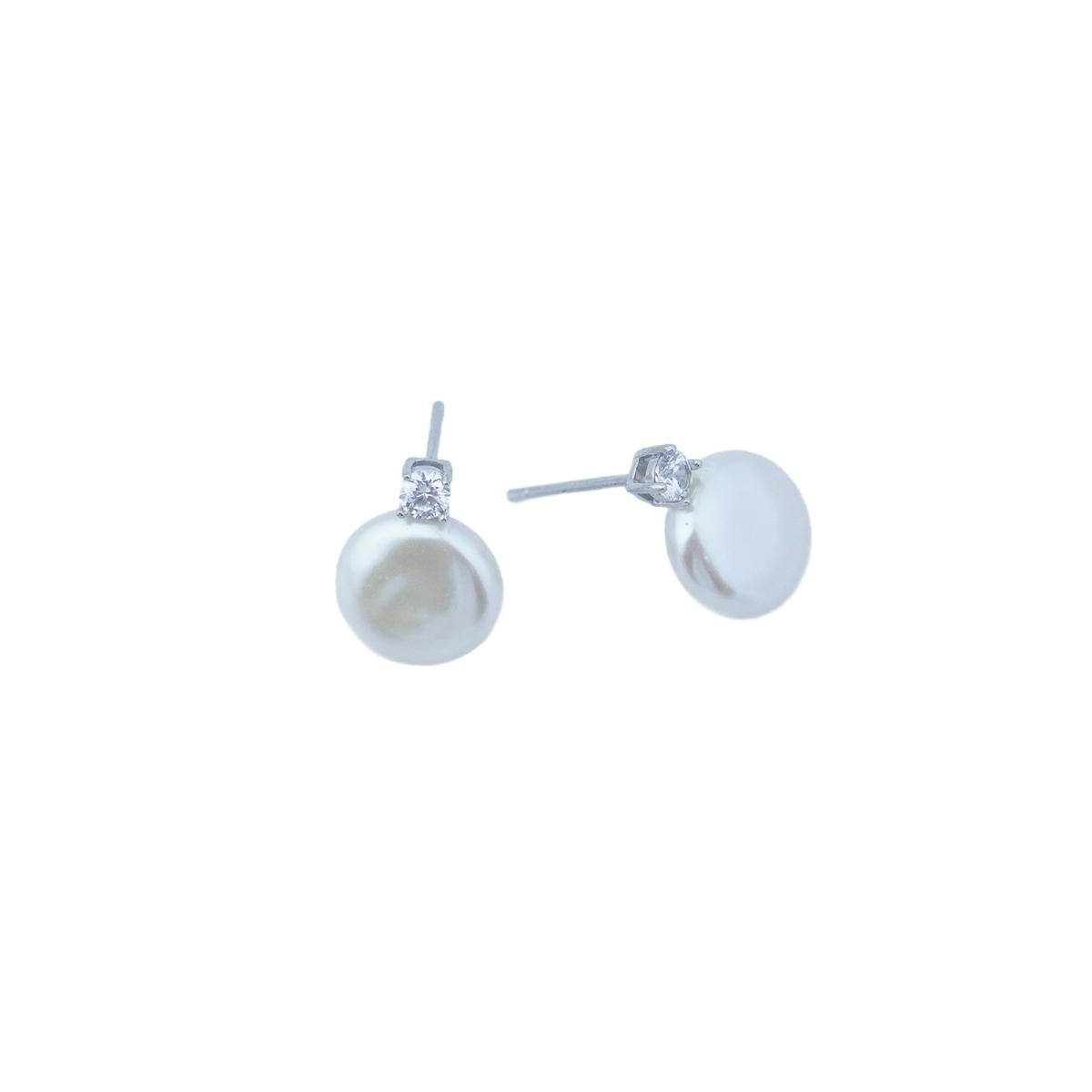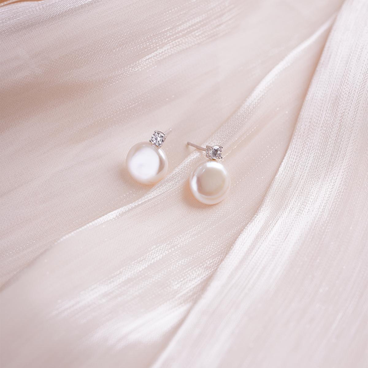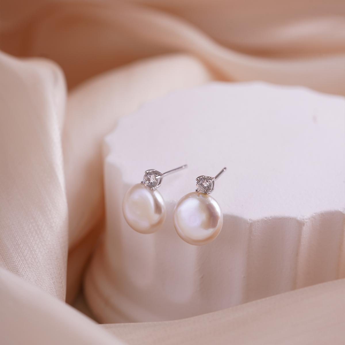 Crafted from natural freshwater pearls, these elegant earrings feature slightly flattened spherical shapes showcasing the pearls' characteristic organic textures and soft luster. Each pearl connects to the post via a meticulously set zirconia stone, secured by a classic four-prong setting for reliable wear. The posts are made of internationally certified S925 sterling silver, finely polished for exceptional skin-friendliness.