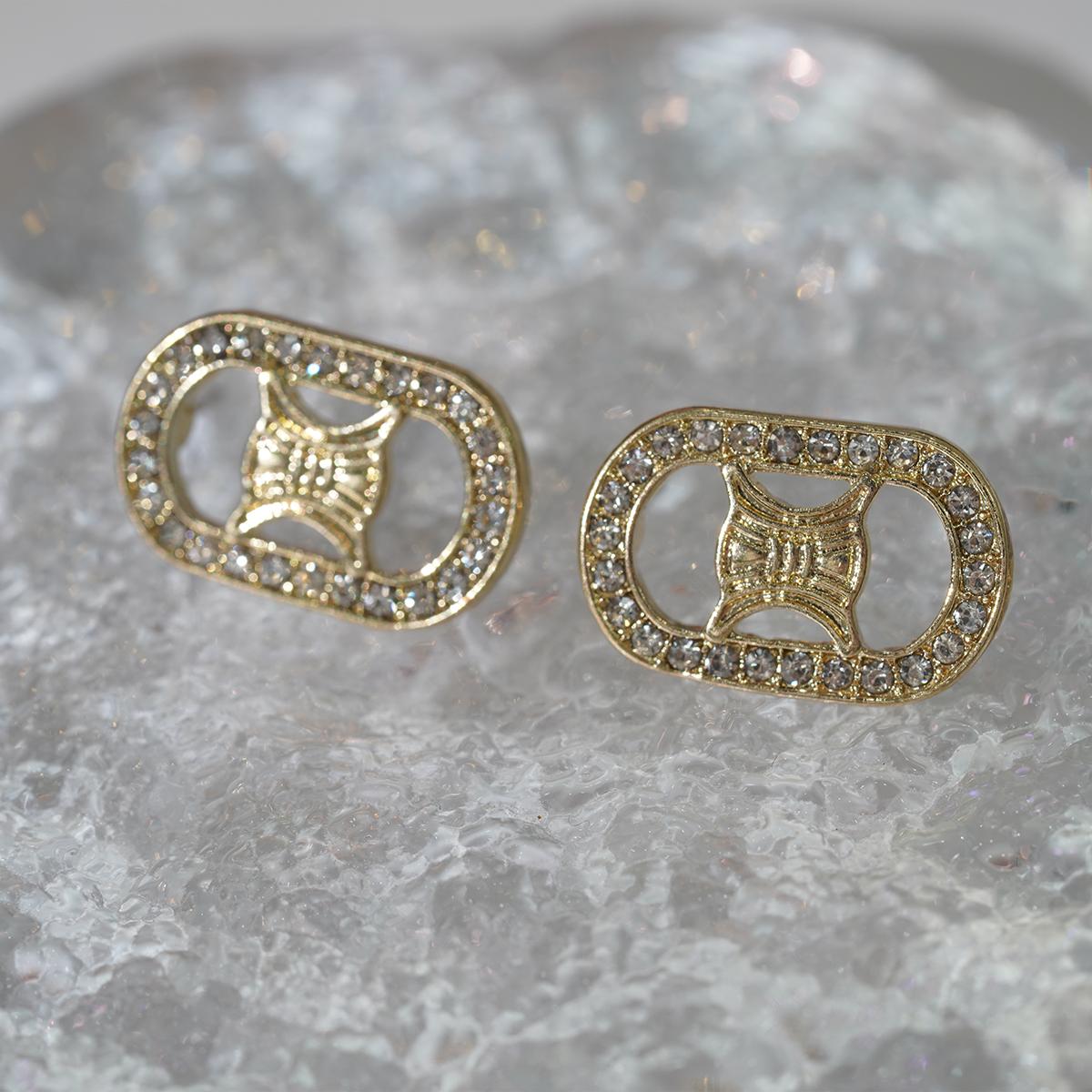 These earrings feature a gold - alloy oval shape with a unique hollow pattern. The edges are inlaid with sparkling zircon decorations, adding a touch of luxury.