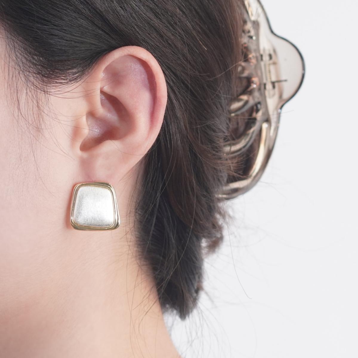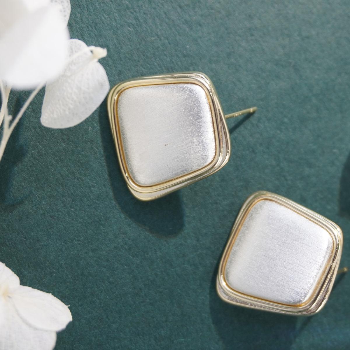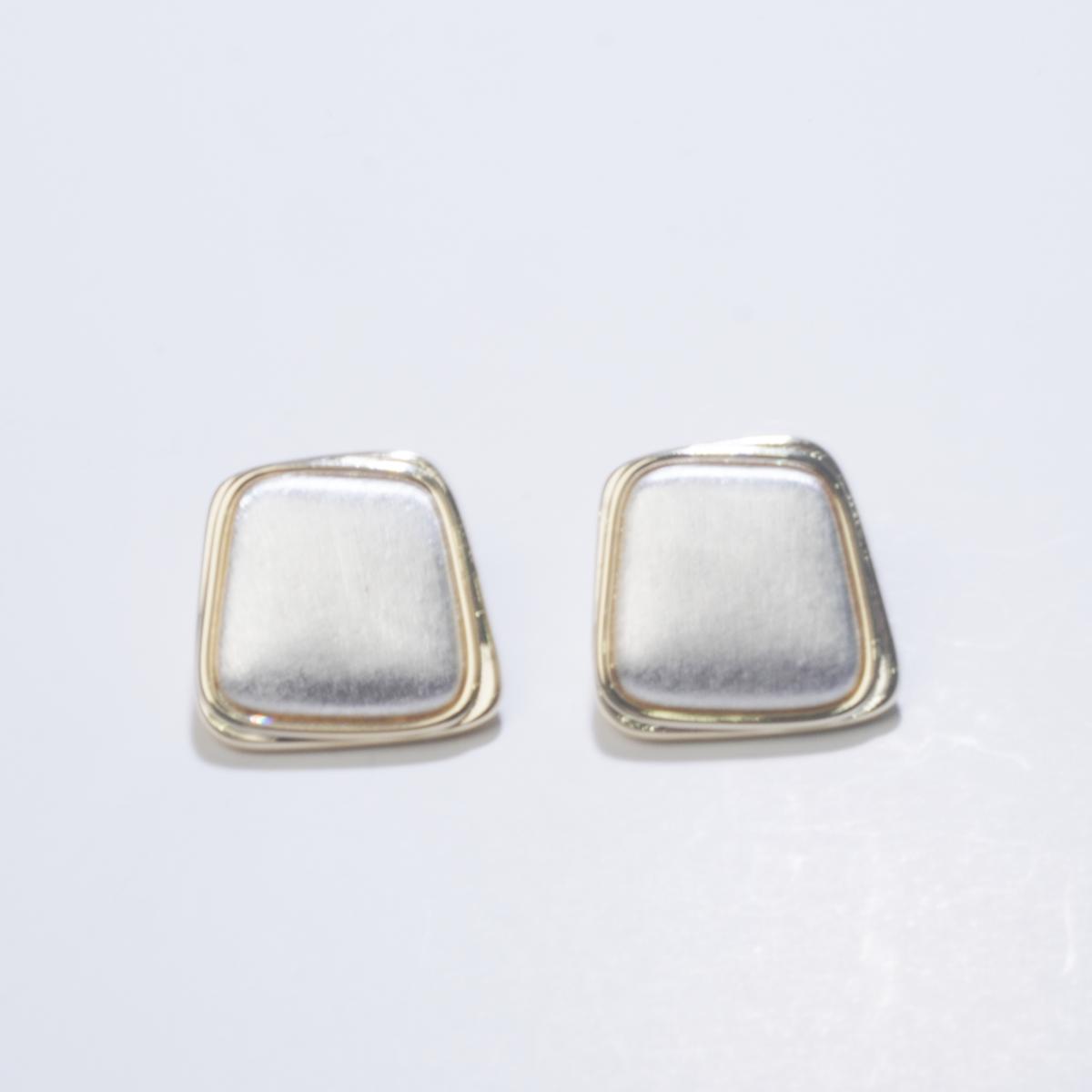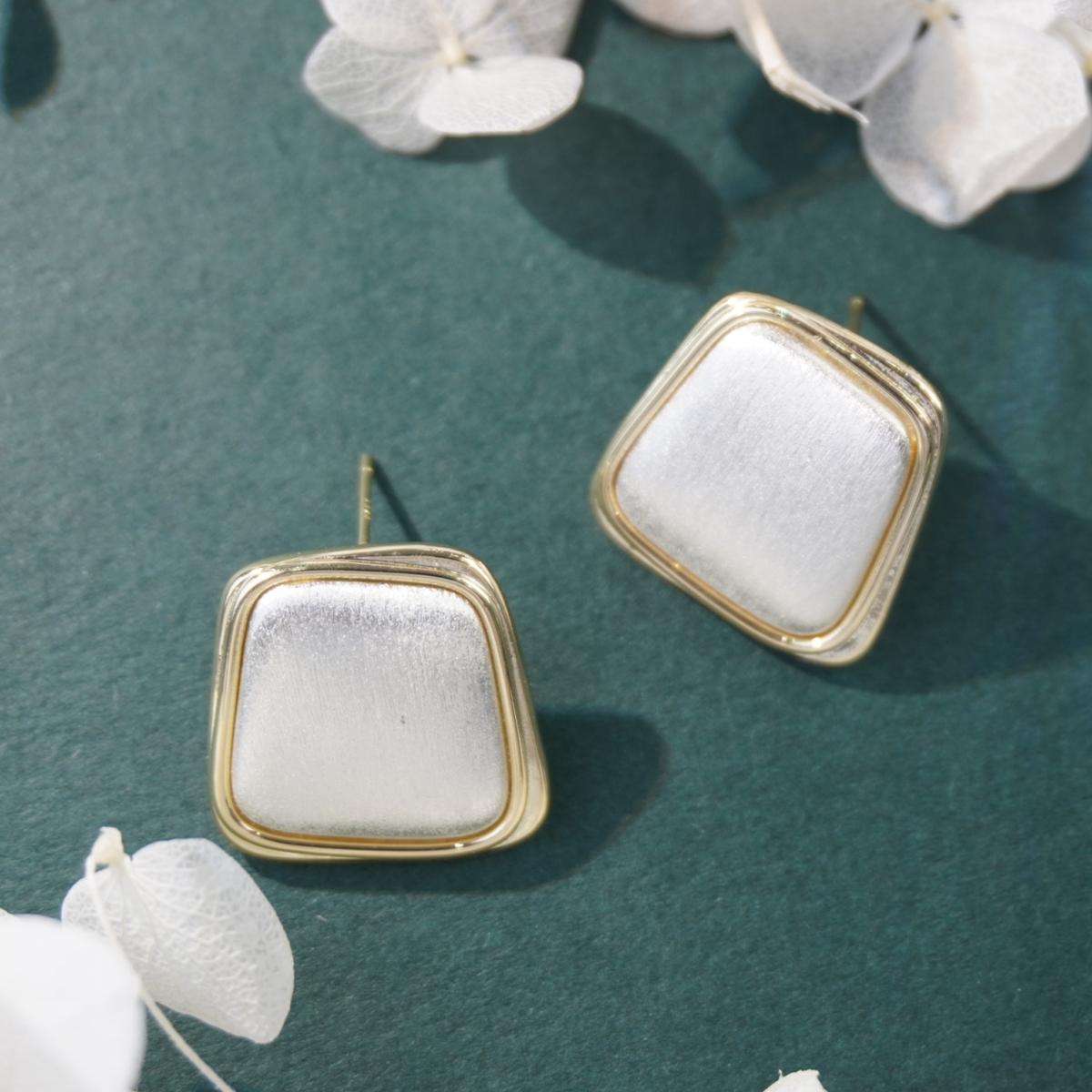 These stud earrings feature a geometric, irregular - rectangle shape. Made of copper, they showcase a two - tone design. The copper frames create smooth lines, outlining the unique form, while the inlaid part adds an extra touch of sophistication. With 925 silver posts, they are gentle on the ears.