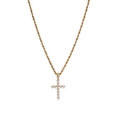 Rope Chain Cross Pendant Necklace in Gold or Silver Plated Finish. This elegantly crafted piece features a classic cross design fully adorned with heart-cut cubic zirconia stones, paired with a textured rope chain for a harmonious blend of symbolic faith and refined sparkle. The contrast between the meticulously set stones and the detailed chain creates a timeless yet modern aesthetic.