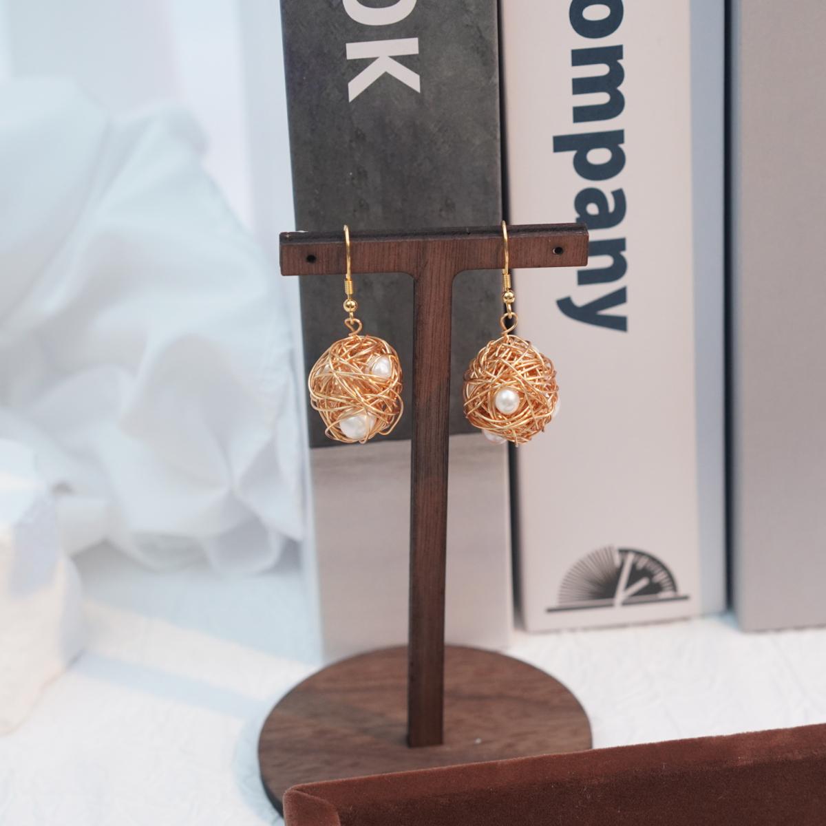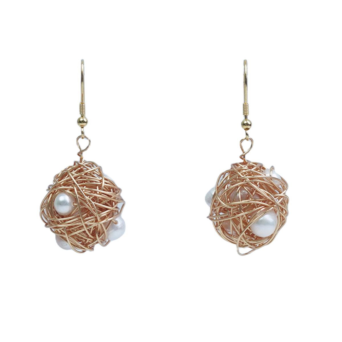 Design & Materials:Inspired by natural bird nests, these earrings use copper - plated 18K gold wires. The wires are twisted to copy the nest’s random, organic form. Pearls, like eggs in a nest, are asymmetrically placed for a lively, creative appearance.