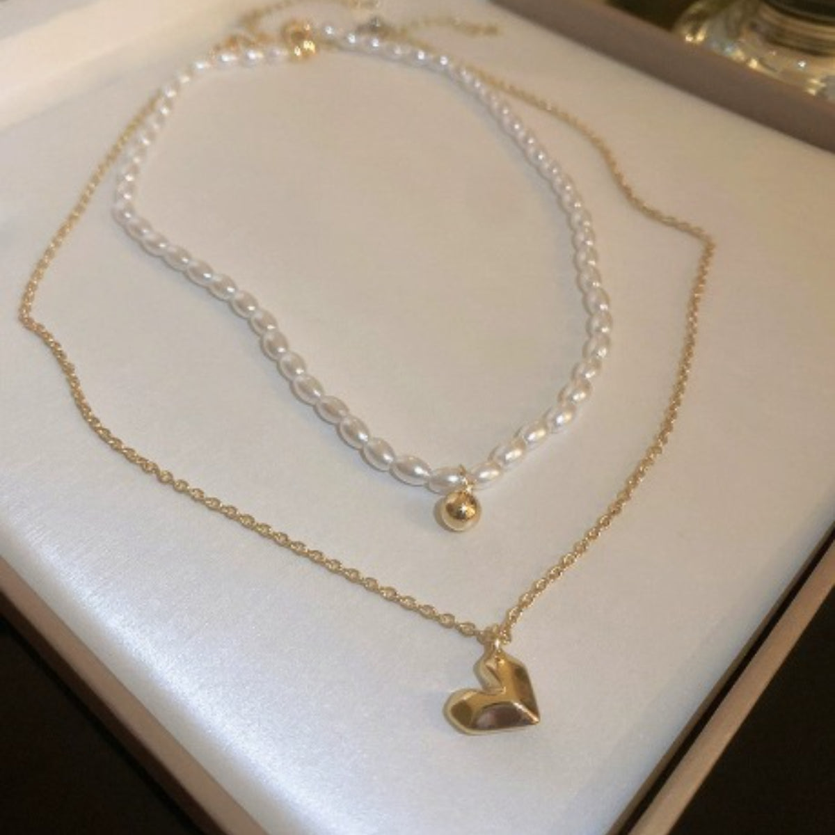 HomeCOPPER MOSS-TT【Pendant Necklace】Copper Alloy Matte Gold Dual Chain Necklace with Heart Pendant, Geometric Contrast Jewelry Modern Elegance for Women