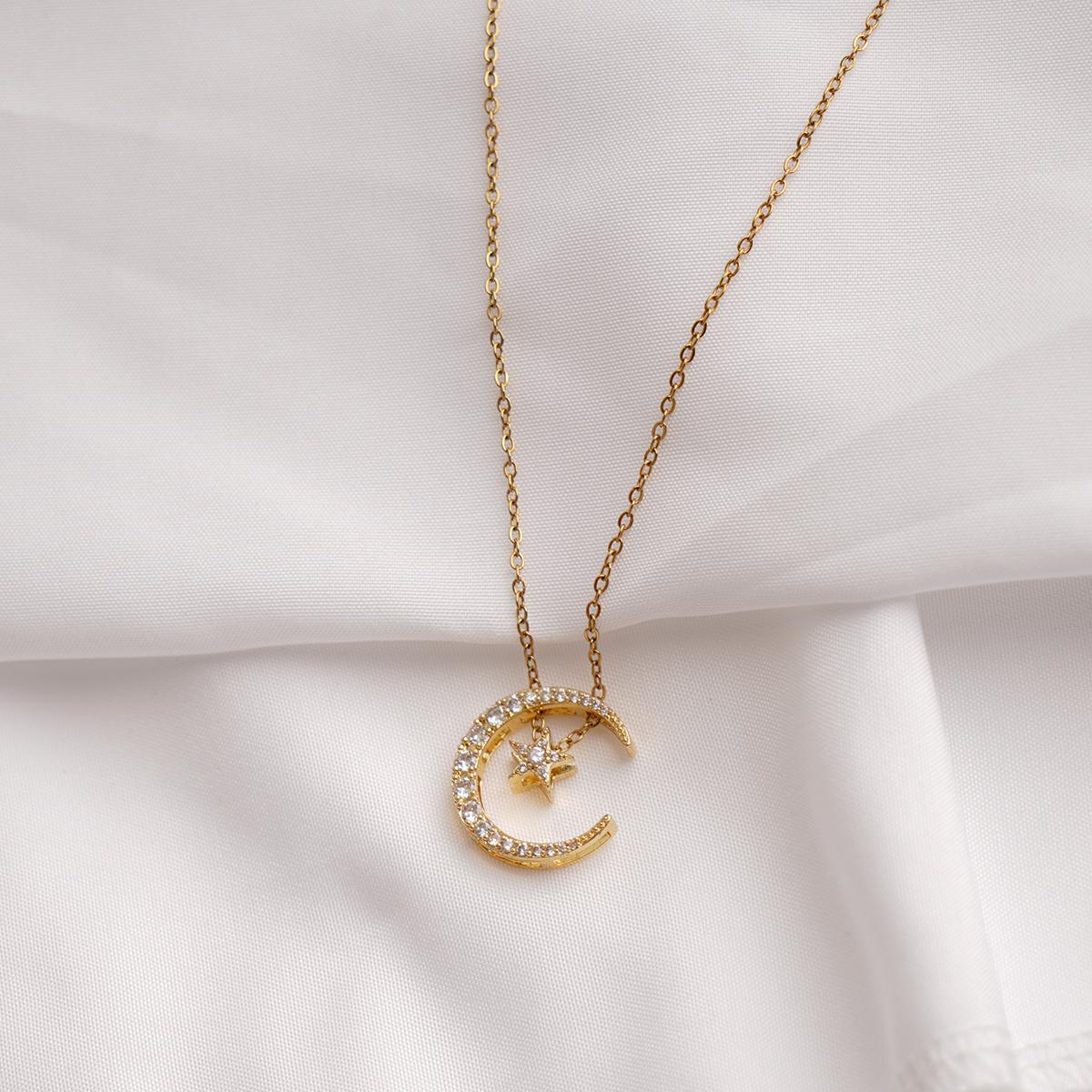 Design & Materials: This celestial necklace showcases a delicate gold-tone copper pendant, featuring a crescent moon meticulously encrusted with sparkling cubic zirconia stones. A tiny star charm hangs gracefully within the moon's curve, creating a dreamy silhouette. It's elegantly suspended on a slender, hypoallergenic stainless steel chain with a warm gold finish.