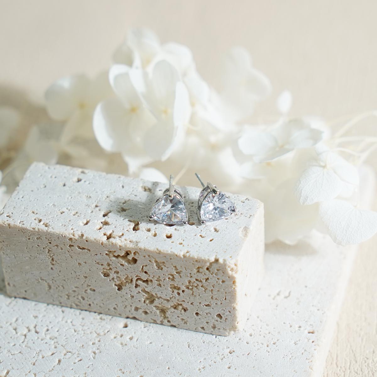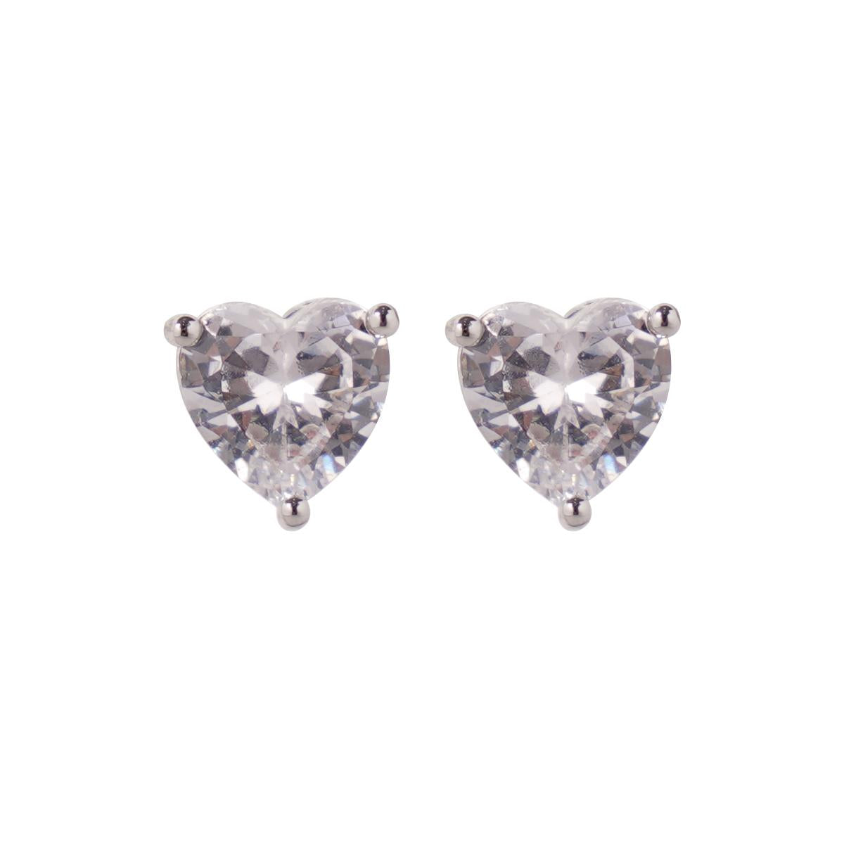 Crafted from silver-tone copper, these symmetrical stud earrings feature a delicate heart-shaped design with a precisely faceted transparent zirconia stone. The multi-faceted cut captures and reflects light with brilliant sparkle, while the slender prongs securely hold the stone to maximize its visual impact. The heart silhouette presents clean lines and balanced proportions, creating an elegant and romantic aesthetic.