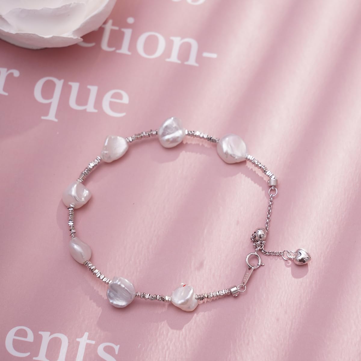 【Elegant Design】This bracelet features a delicate silver chain adorned with irregularly shaped natural white freshwater pearls. Each pearl displays a soft, natural glow and plump form, reflecting a classic Baroque aesthetic. The adjustable extender chain with a heart-shaped charm and secure lobster clasp allows for both a customizable fit and reliable fastening.