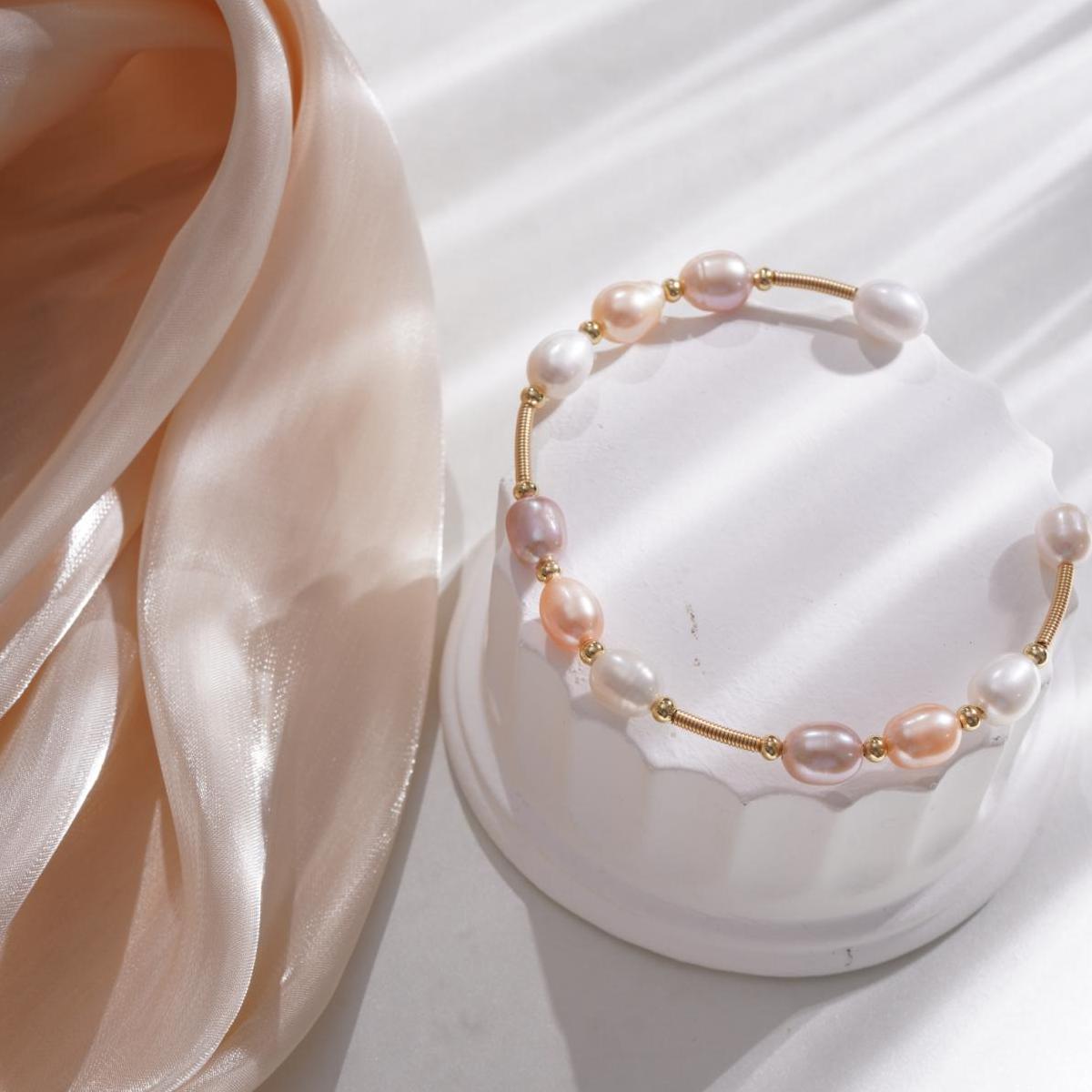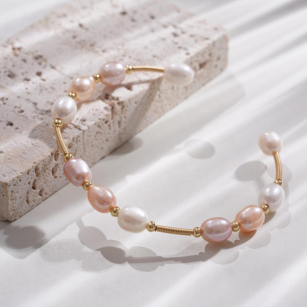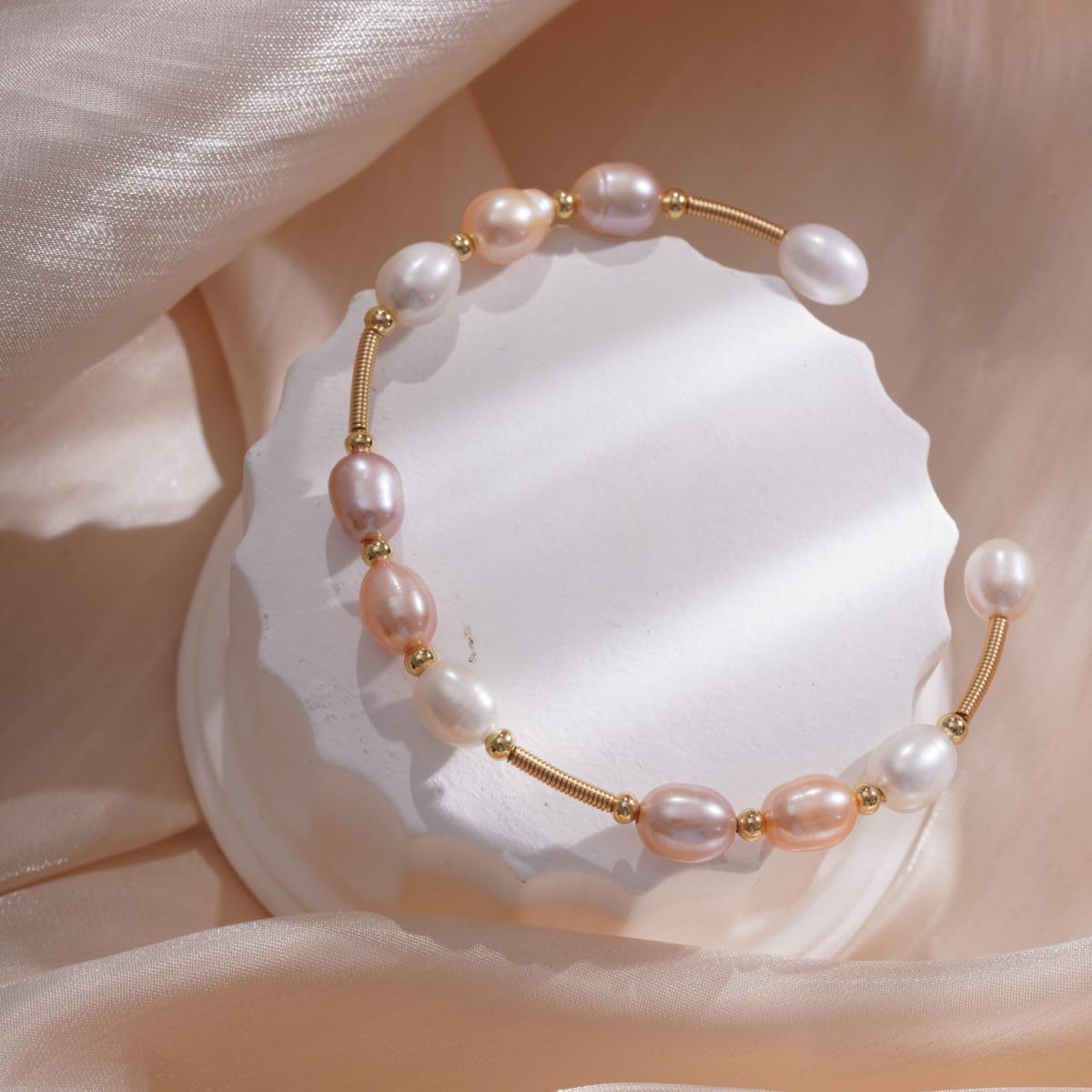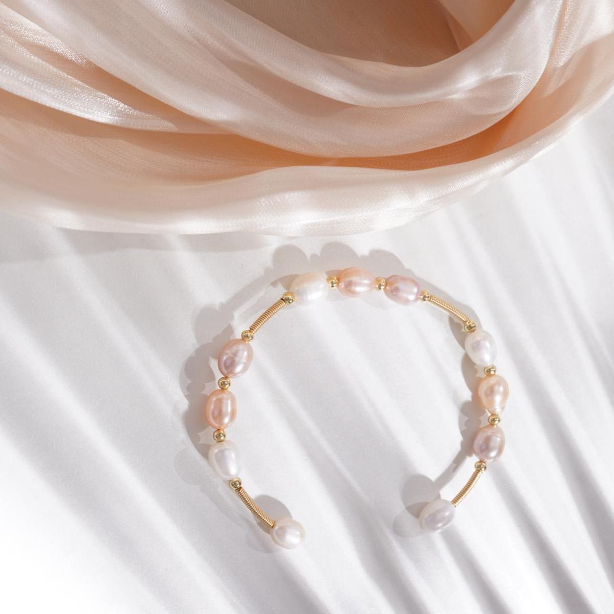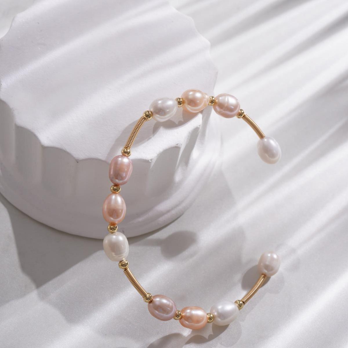 Crafted with skin-friendly natural freshwater pearls and durable gold-tone plated brass, its open-ended construction adapts comfortably to wrist sizes. Resilient materials ensure long-lasting wear while maintaining structural integrity.