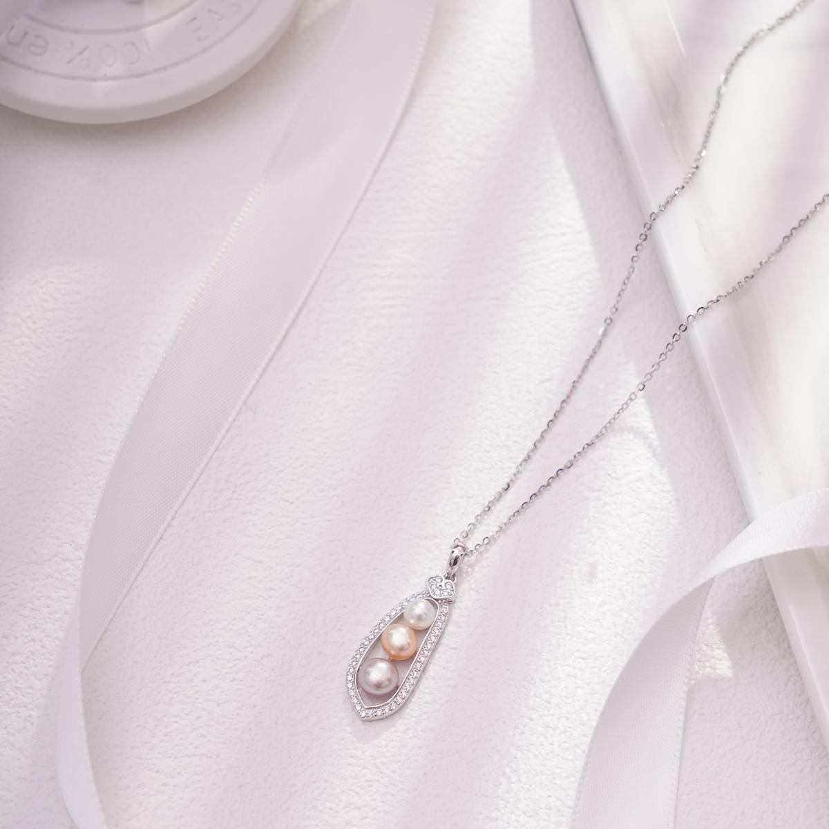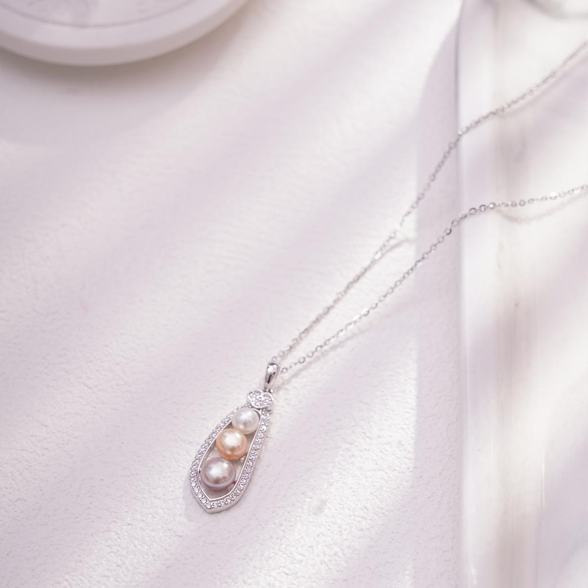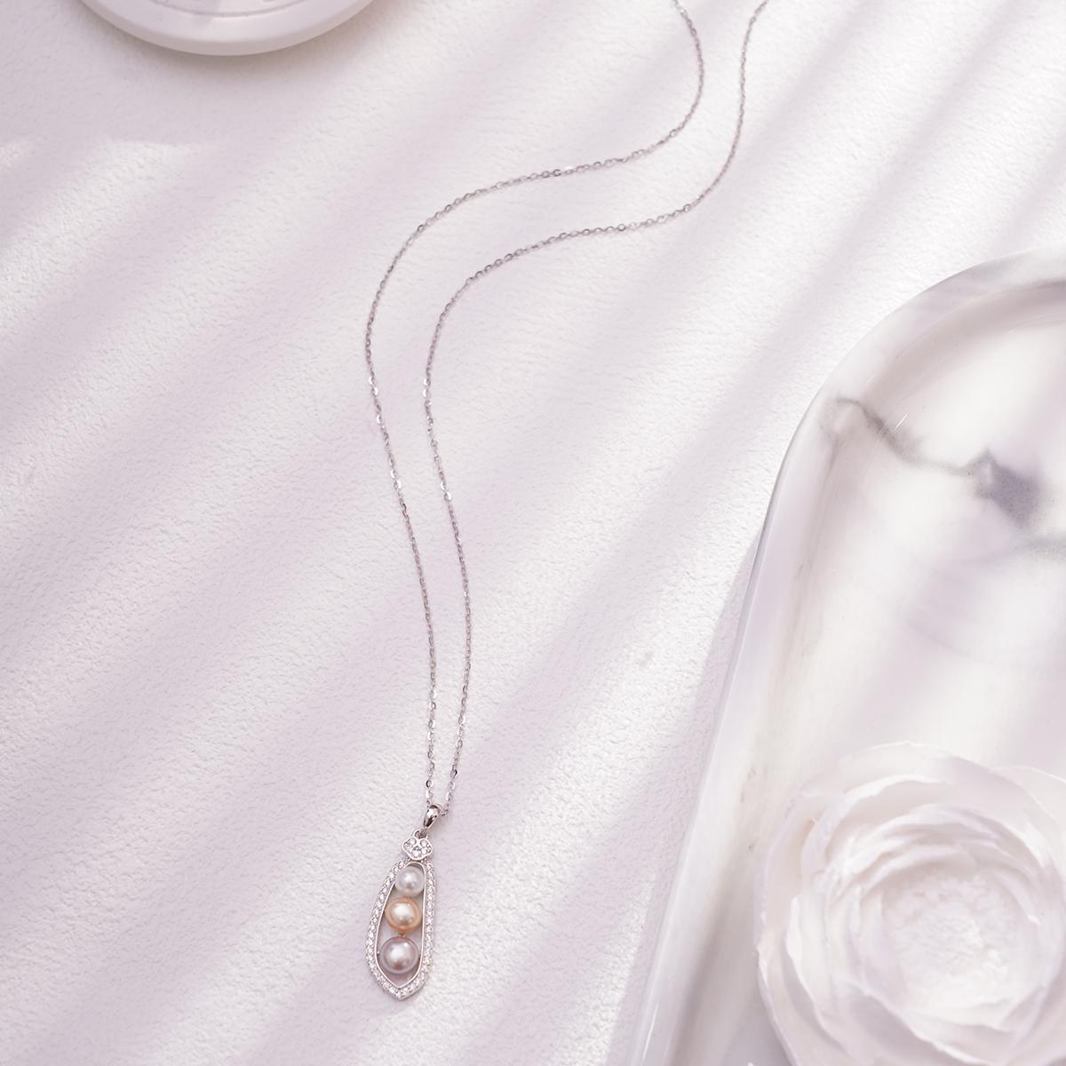 The necklace features a delicate silver chain with a finely polished surface, offering a bright and pure metallic luster. The pendant is designed in the shape of a naturally inspired pea pod, outlined by a precise silver frame. The edges of the frame are pavé-set with dense transparent zircons that refract a delicate shimmer. Three natural freshwater pearls—white, light champagne, and soft purple—are artfully embedded inside the pendant. The pearls are plump and smooth, emitting a natural glow that mimics the organic form of pea pods, enhancing the lifelike beauty of the design.