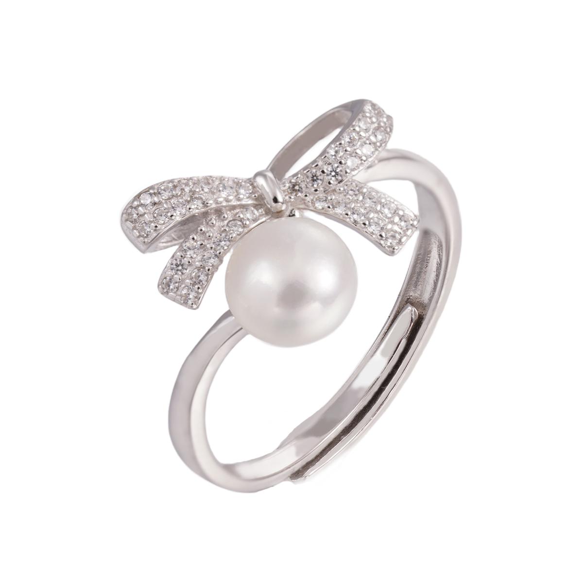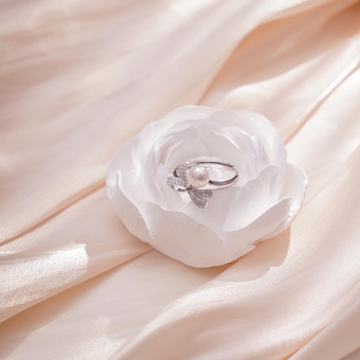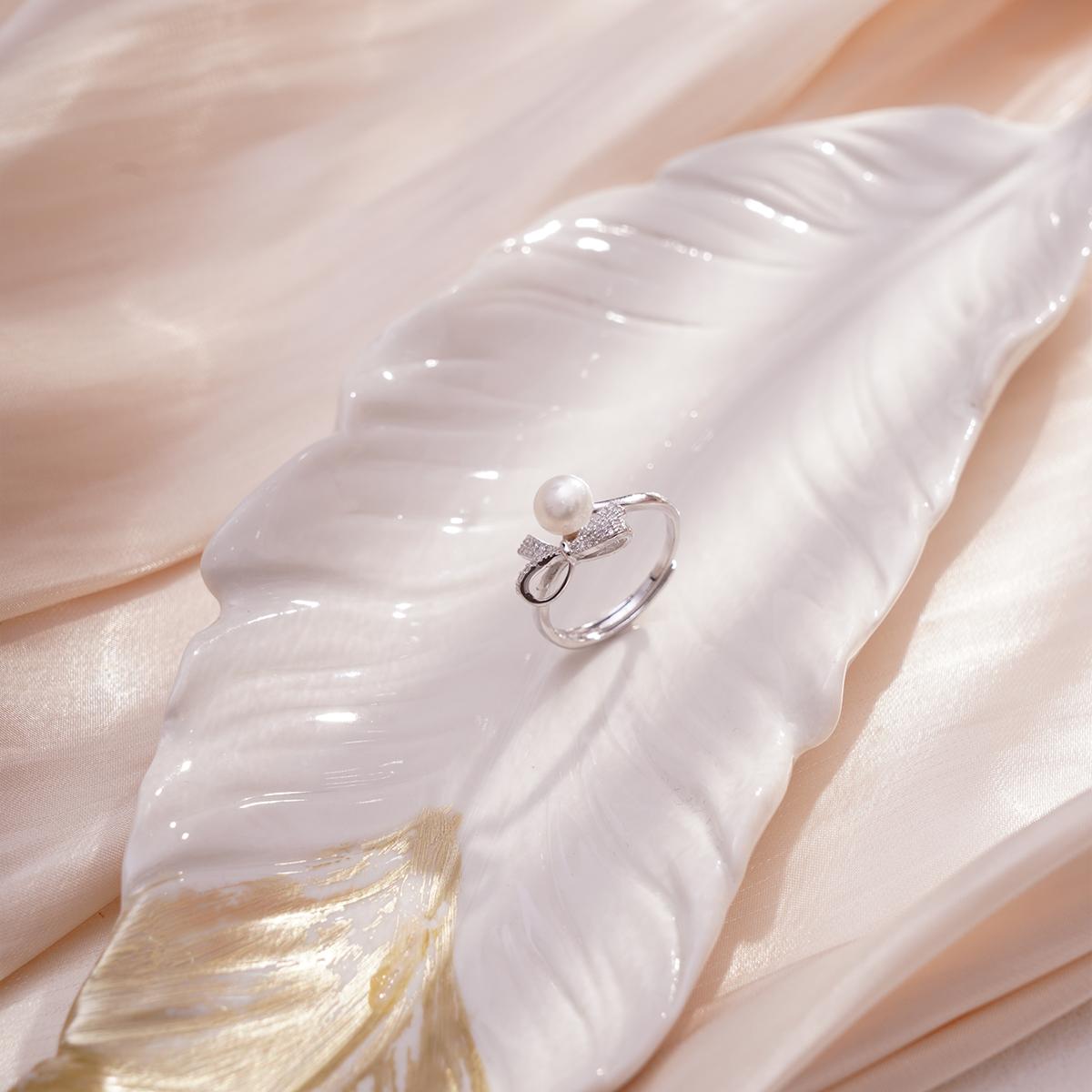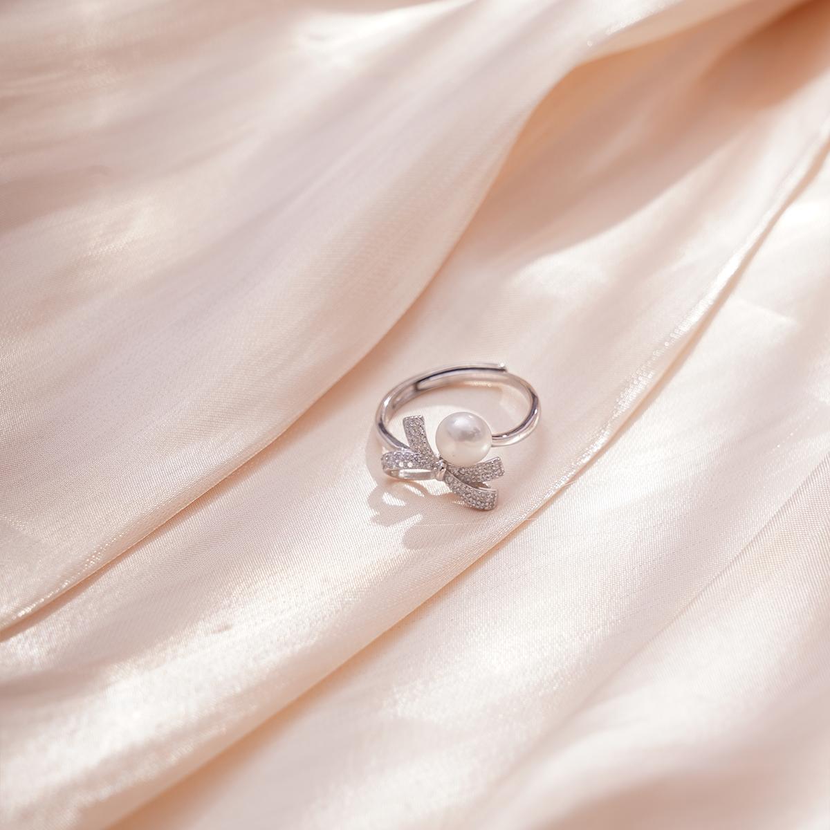 The ring body is crafted from polished silver metal, featuring an adjustable band design with a finely smoothed surface that offers a silky touch and uniform luster. At the center of the setting, a plump and round white natural freshwater pearl is mounted, emanating a soft, creamy glow with a warm and elegant texture. Above the pearl, an exquisite bow-shaped ornament adorns the piece. This bow is meticulously outlined with metal wire and pavé-set with transparent zircons arranged in an orderly manner, refracting dazzling brilliance.