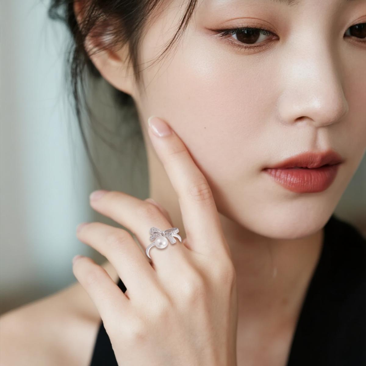 This ring artfully combines the fiery sparkle of zircons with the soft, luminous glow of pearls, presenting an elegant yet subtly luxurious style. The silver bow design adds a dynamic and graceful touch, while the densely set zircons enhance the dazzling details, lending an overall sense of opulence. The romantic connotations of the bow blend seamlessly with the timeless warmth of pearls, together creating a unique style that balances youthful charm and understated luxury.