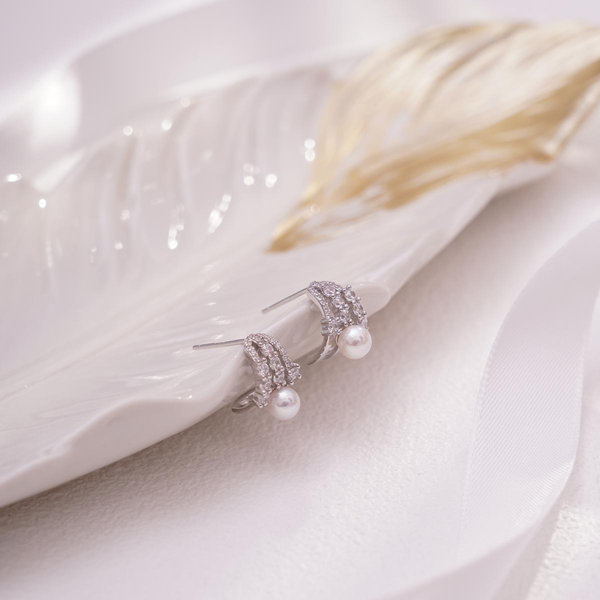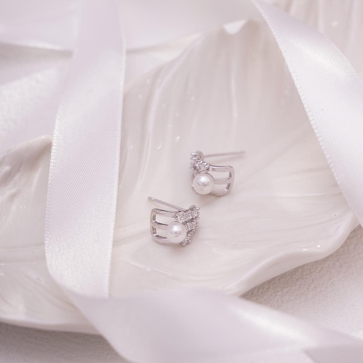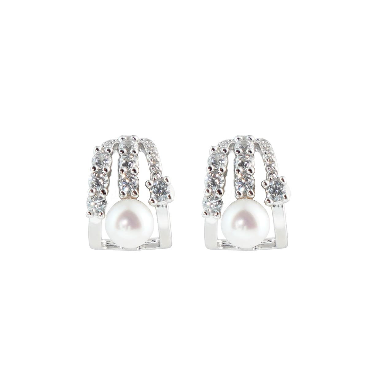 U-shape silver frame maintains precise geometric lines with seamless matte/polish combination. Pearl is securely nestled in a structured silver cup setting. Zirconia stones exhibit clean cutting and consistent prong alignment without burrs. Ear post junctions show smooth welding. Sterling silver construction ensures lasting wear.
