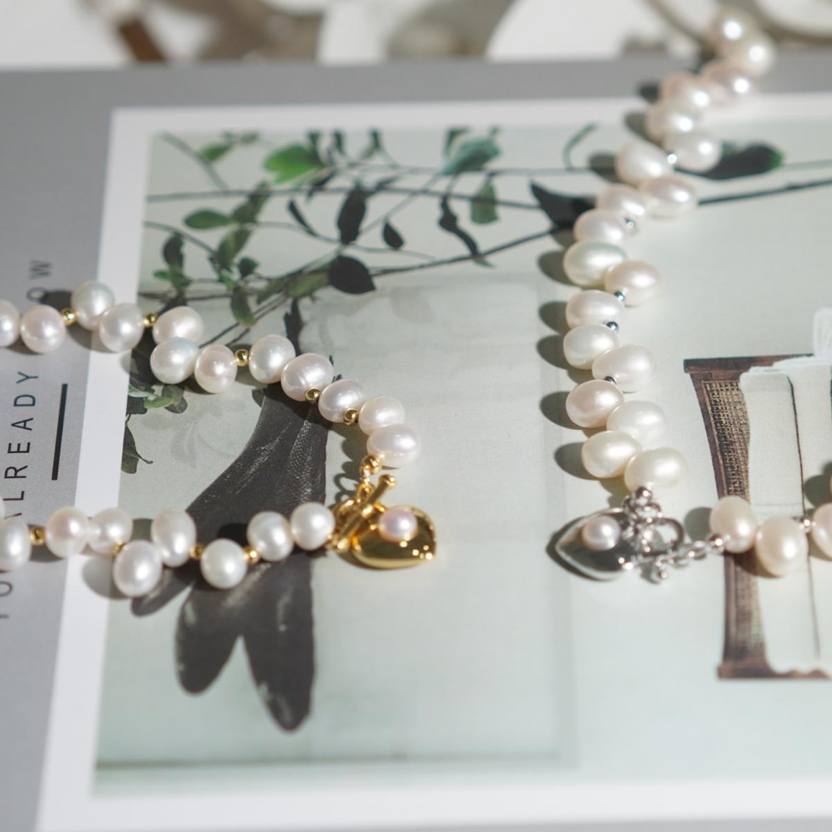 This exquisite necklace combines sterling silver with natural freshwater pearls, featuring a delicate chain where lustrous silver beads alternate with plump, round white pearls. The pendant—a heart-shaped silver charm adorned with a single pearl—adds a romantic touch, while the practical yet elegant OT clasp ensures both functionality and refined detailing.