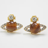 These stud earrings feature a gold-plated alloy base, anchored by a round tiger's eye gemstone (showcasing rich brownish-golden veining). The design is elevated by a halo of white cubic zirconia along the “Saturn ring” frame and a cross-shaped zircon cluster at the top, creating a geometrically striking, vintage-inspired look.
