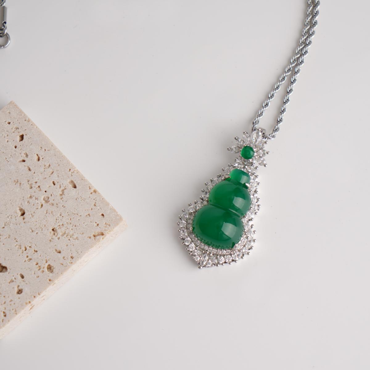 【Pendant Necklace】Green Chalcedony Gourd Pendant Necklace with  Alloy Frame & Zircon Accents fashion Jewelry gift for women Fortune Blessing