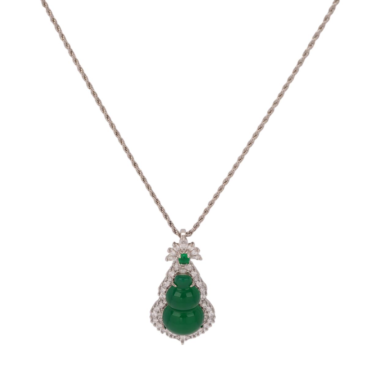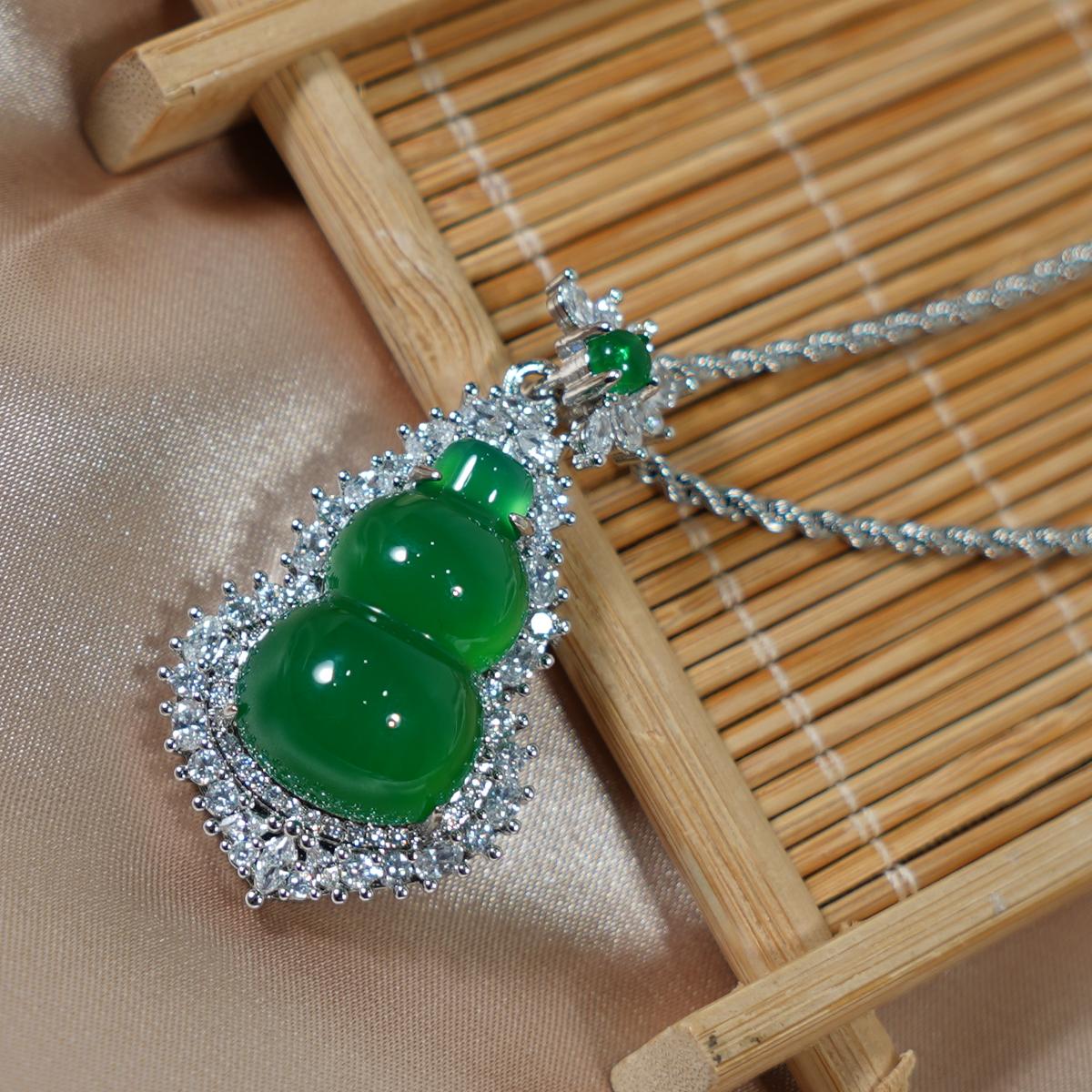 【Pendant Necklace】Green Chalcedony Gourd Pendant Necklace with Alloy Frame & Zircon Accents fashion Jewelry gift for women Fortune Blessing