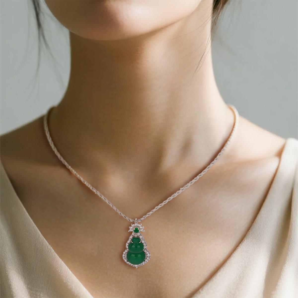 The dual-ball chalcedony gourd exhibits plump, uniformly fresh green tones with consistent saturation. The hollow alloy edging enhances structural dimensionality while maintaining lightweight wearability. Precision-set zircons encircling the frame amplify refined sparkle without overpowering the design. The twisted rope chain delivers textured visual depth and secure durability, proportionally balanced against the pendant for comfortable, all-day elegance.