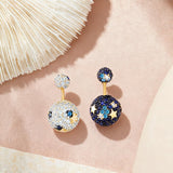 These celestial-inspired earrings feature a dual-sphere design with a smaller upper sphere adorned with clear, blue, gold, and white zirconias, and a larger lower sphere covered in deep blue zircons with gold star patterns. Crafted from hypoallergenic 14K gold plated sterling silver, they offer a secure screw-back closure for comfortable wear. Weighing 12.4g, the intricate craftsmanship and night-sky color harmony make them a versatile statement piece for both daily elegance and special occasions.