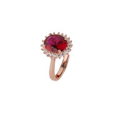 A bold statement ring featuring a vibrant ruby or spinel centerstone encircled by a halo of sparkling cubic zirconias in a sunburst design. Crafted in hypoallergenic 14K rose gold plated sterling silver with an adjustable open shank (US Size 7) for comfortable wear. Meticulously set with premium gemstones and shiny zircons for dazzling brilliance. Perfectly gift-boxed for birthdays, anniversaries, or as a dramatic promise gift for standout elegance.