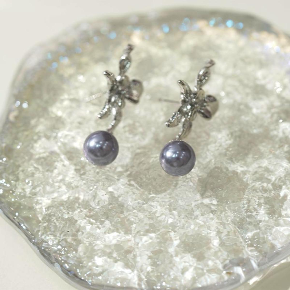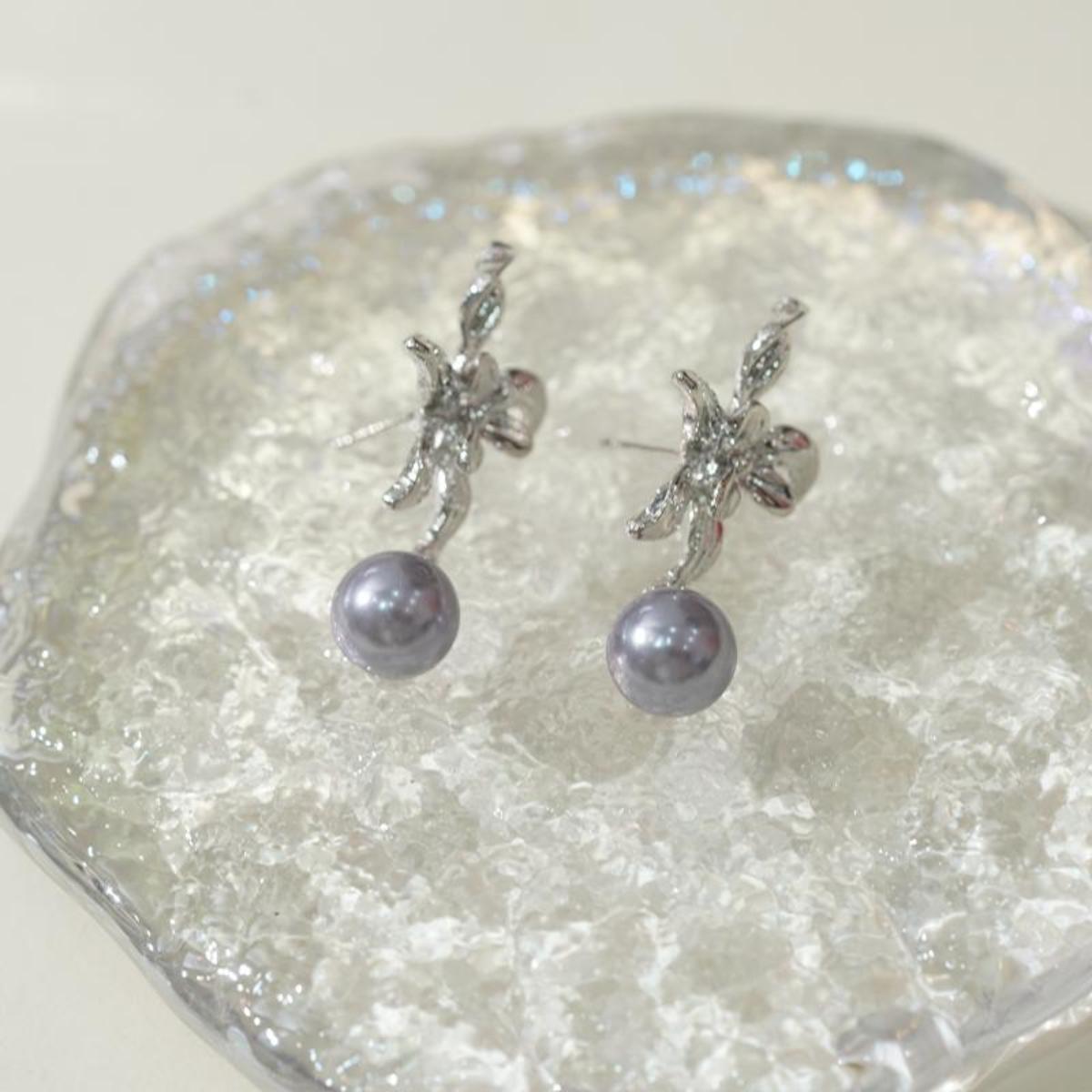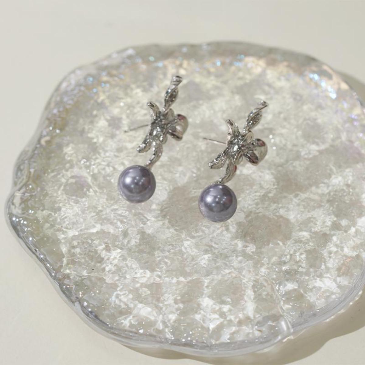 These stud earrings showcase a 3D floral structure — alloy petals feature irregular textured folds (carved-like details) for layered depth, finished in a matte silver tone. Below, a rounded lavender-grey plastic bead (with soft sheen) dangles via metal connectors, creating a “flower + bead” contrast of matte metal and glossy accents.