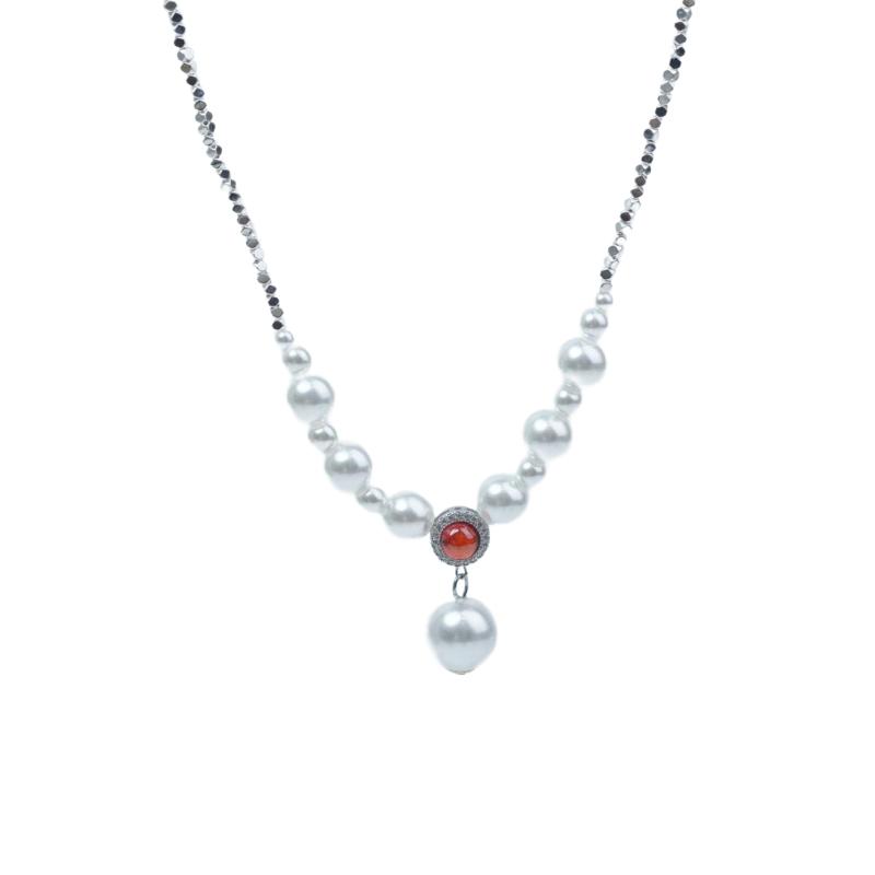 Thin silver-tone copper chain with smooth texture. Features multiple round synthetic pearls in graduated sizes. Centerpiece: prong-set red zircon surrounded by tiny clear zircon accents. Bottom drop: a larger synthetic pearl. Colors blend neutrally (white pearls, grey chain, red stone).