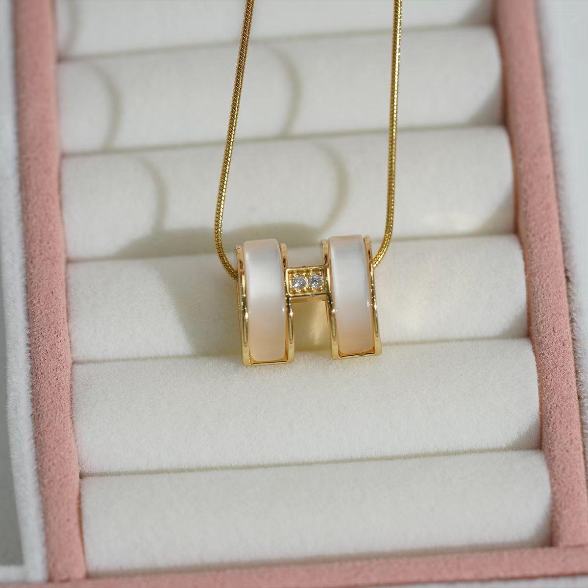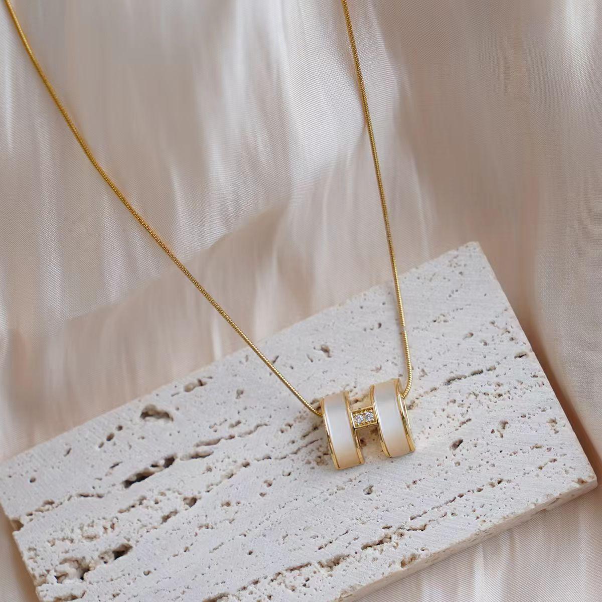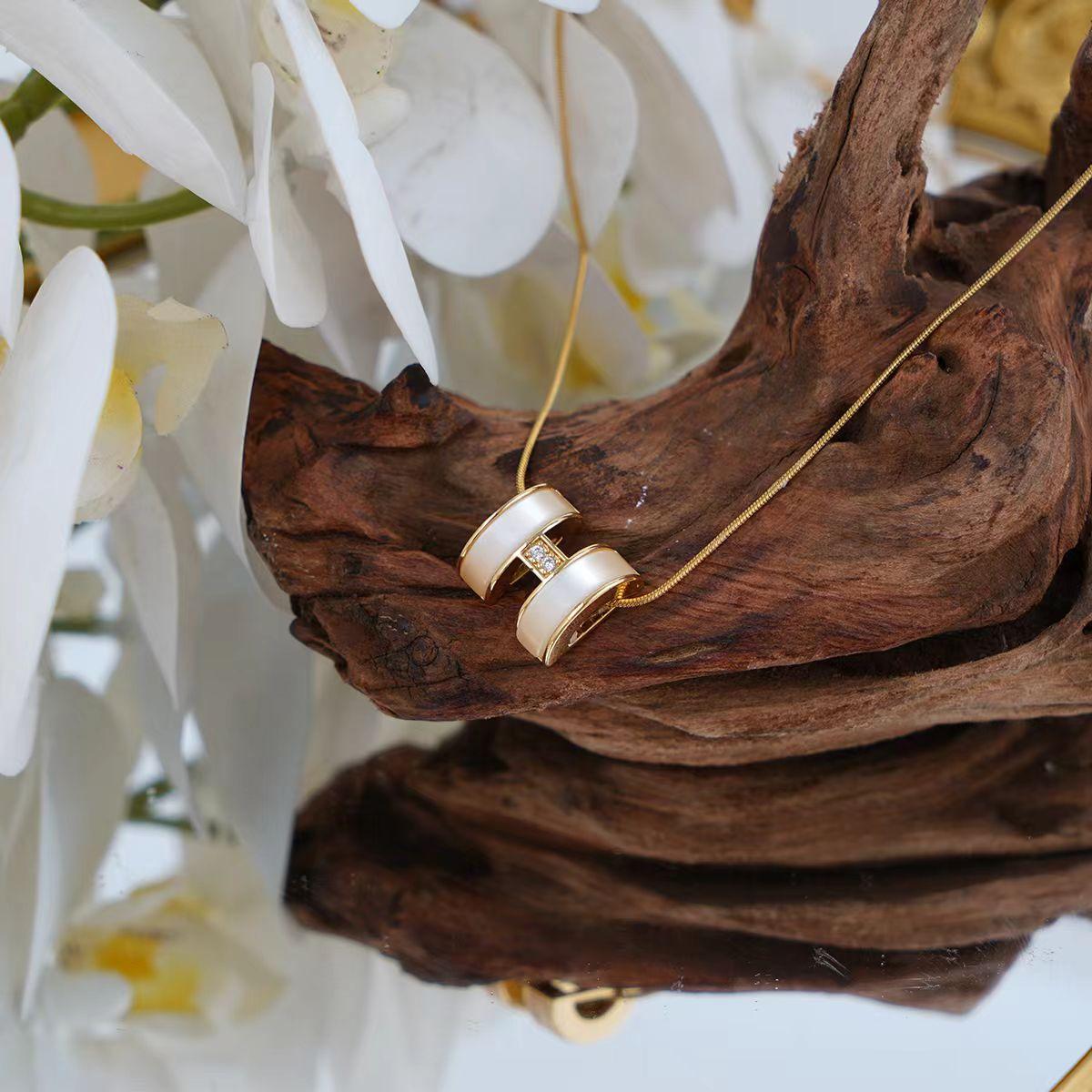 【Necklace】Pearlescent Cylinder Necklace Gold Stainless Steel Chain Zircon Accent Minimalist Modern Elegant Jewelry for Women