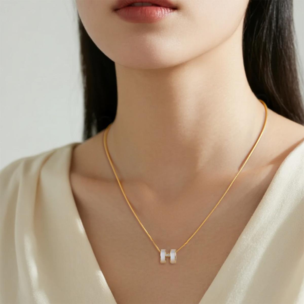 Design & Materials: This contemporary necklace features two pearlescent white cylinders crafted from copper with a soft iridescent finish. The cylinders are connected by a gold-tone metal link adorned with sparkling zircon accents. The entire pendant hangs from a sleek gold-tone stainless steel chain that complements the minimalist design.