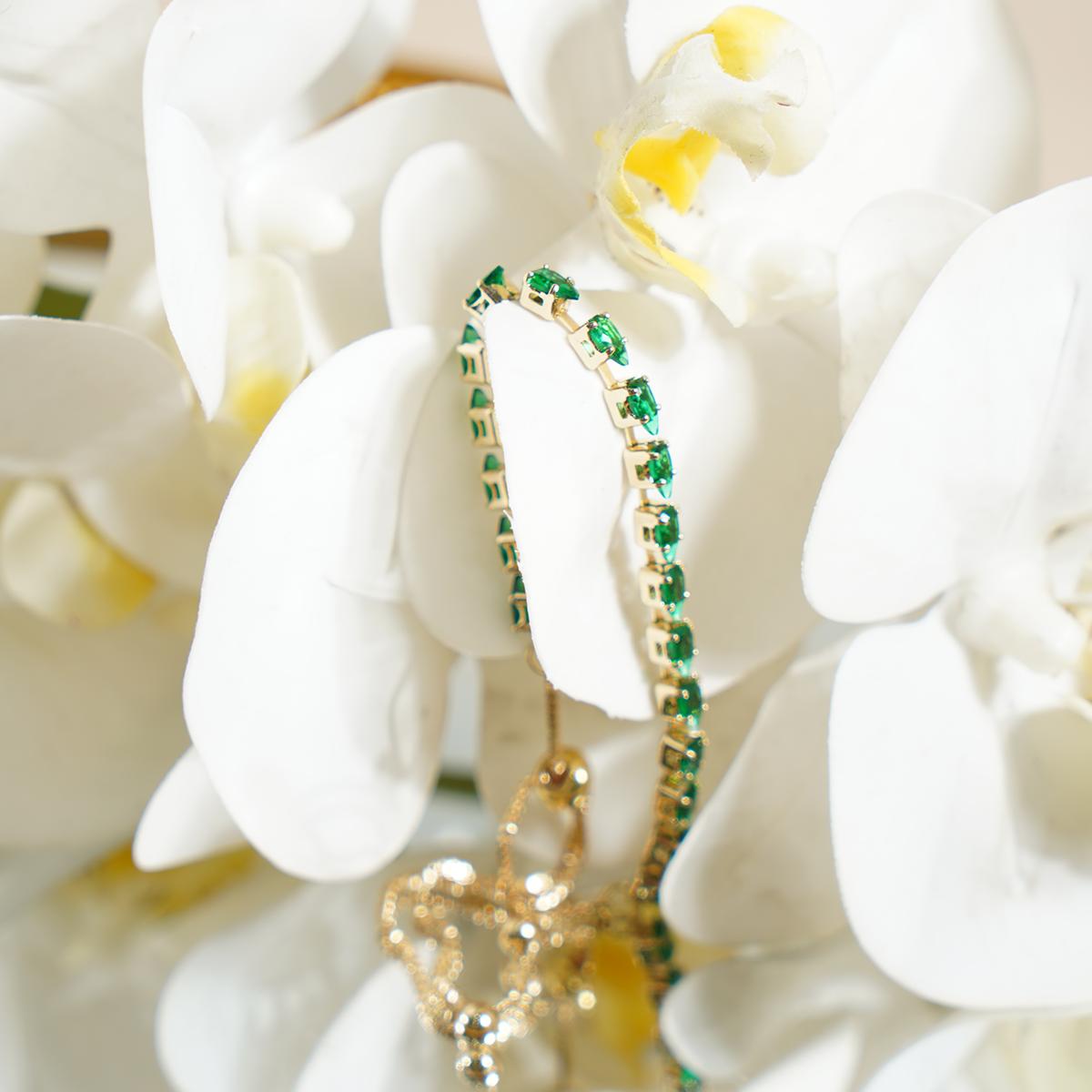 Design & Materials: This exquisite tennis bracelet features a row of vibrant green cubic zirconia stones meticulously set in a rose gold-toned stainless steel chain. The stones are evenly spaced and secured with precise prong settings, creating a continuous sparkle. The adjustable sliding clasp allows for a customizable fit, ensuring both security and comfort.