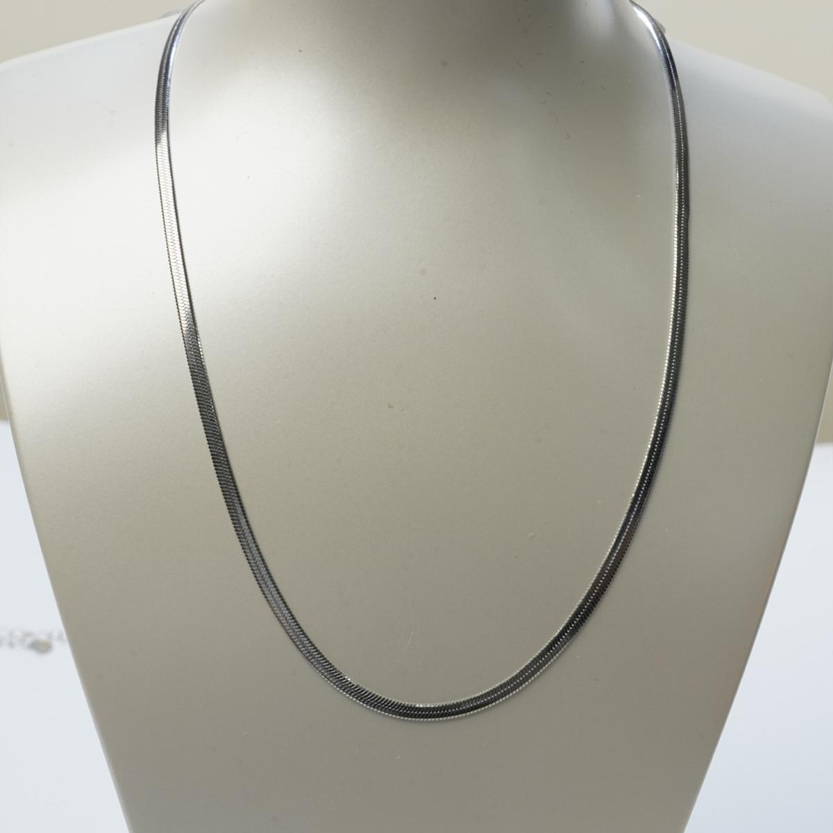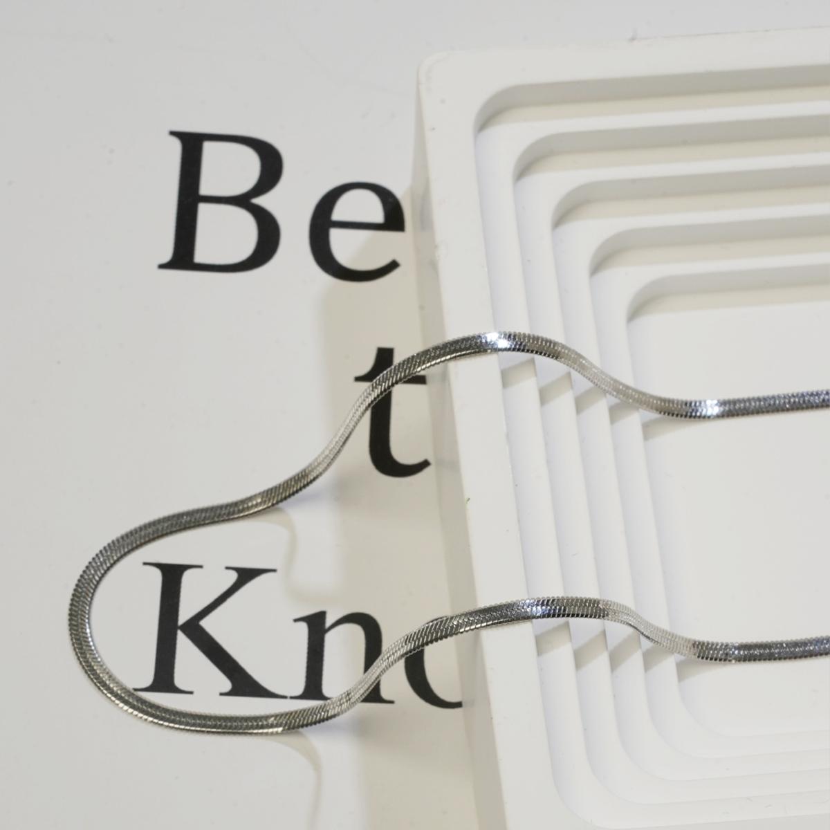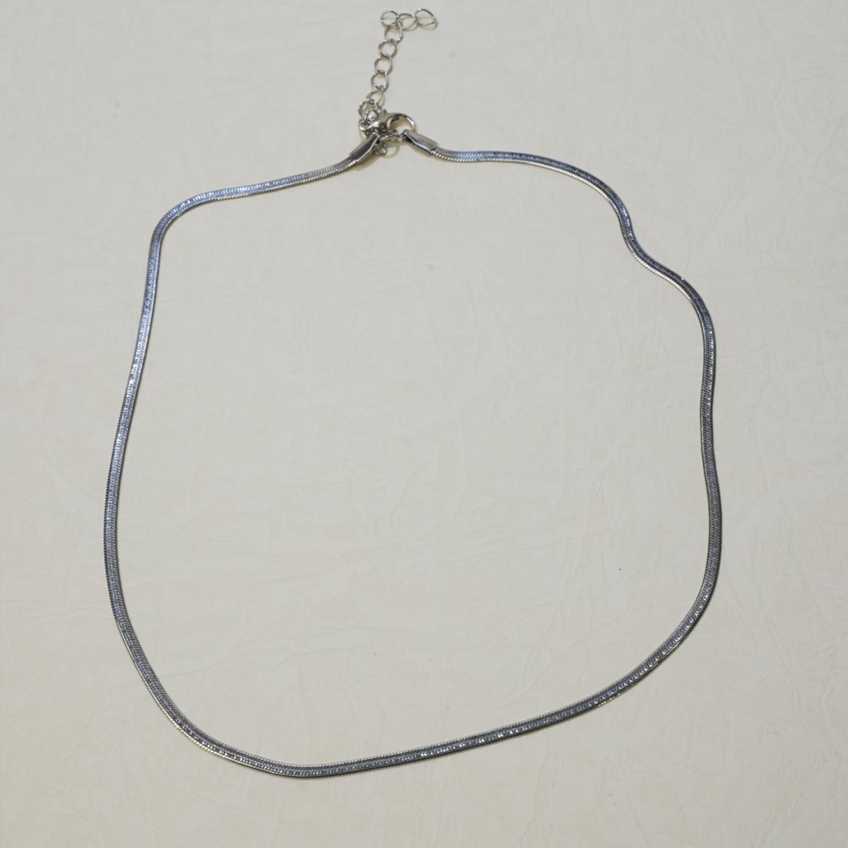 This is a classic snake chain necklace. Its chain structure resembles snake bones, with closely - linked links for a smooth line. The flat - faced alloy material has a shiny surface, not easy to deform, showing a metallic luster.