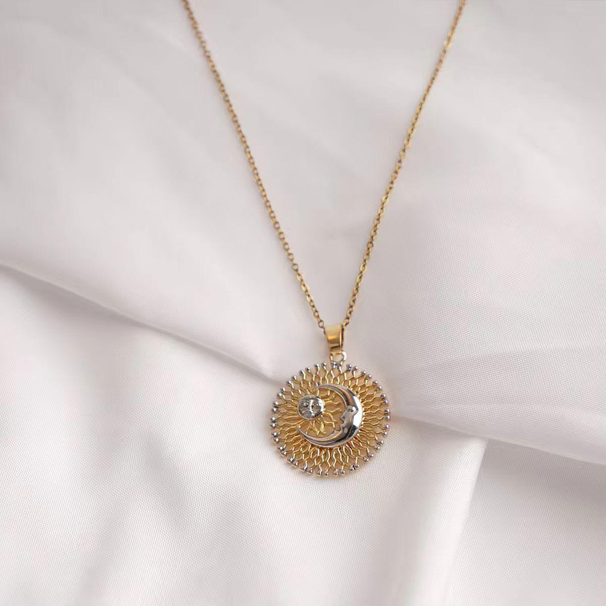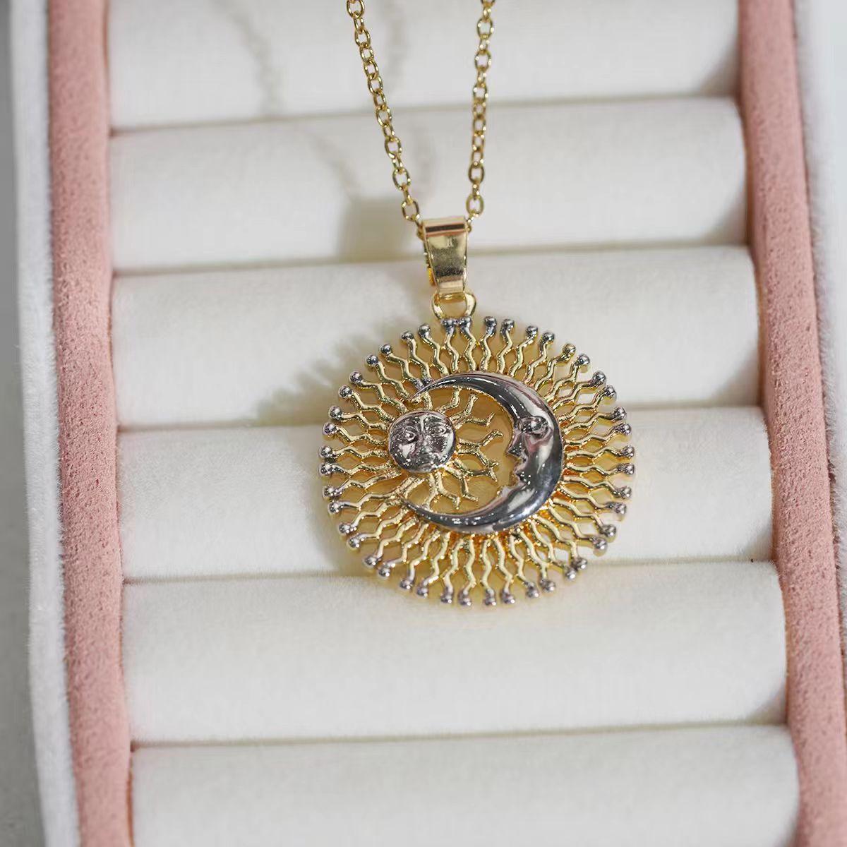 Design & Materials: This captivating necklace features a finely crafted copper pendant, artfully designed with a sun and moon motif within a circular openwork frame. It is suspended from a durable and stainless steel chain, finished in a warm gold tone for a radiant look.