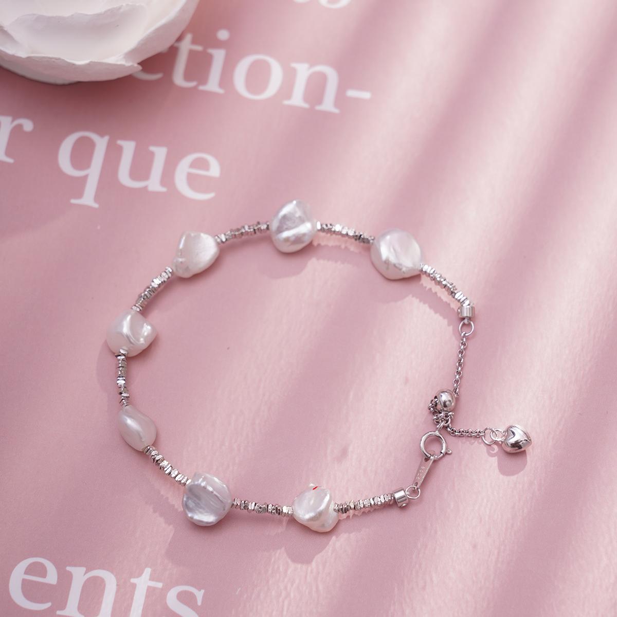 Crafted primarily from silver, the bracelet offers stable material properties, resisting significant oxidation and minimizing skin irritation over long-term wear. The natural freshwater pearls provide a smooth and skin-friendly feel with a lively, natural glow. The chain is finely polished for a smooth texture, and each pearl is securely set, reflecting meticulous craftsmanship. The adjustable length ensures a comfortable and personalized fit, while the heart-shaped charm adds a touch of delicate romance. The lobster clasp guarantees safety and security during wear. Lightweight and well-balanced, the bracelet offers a comfortable and effortless wearing experience.