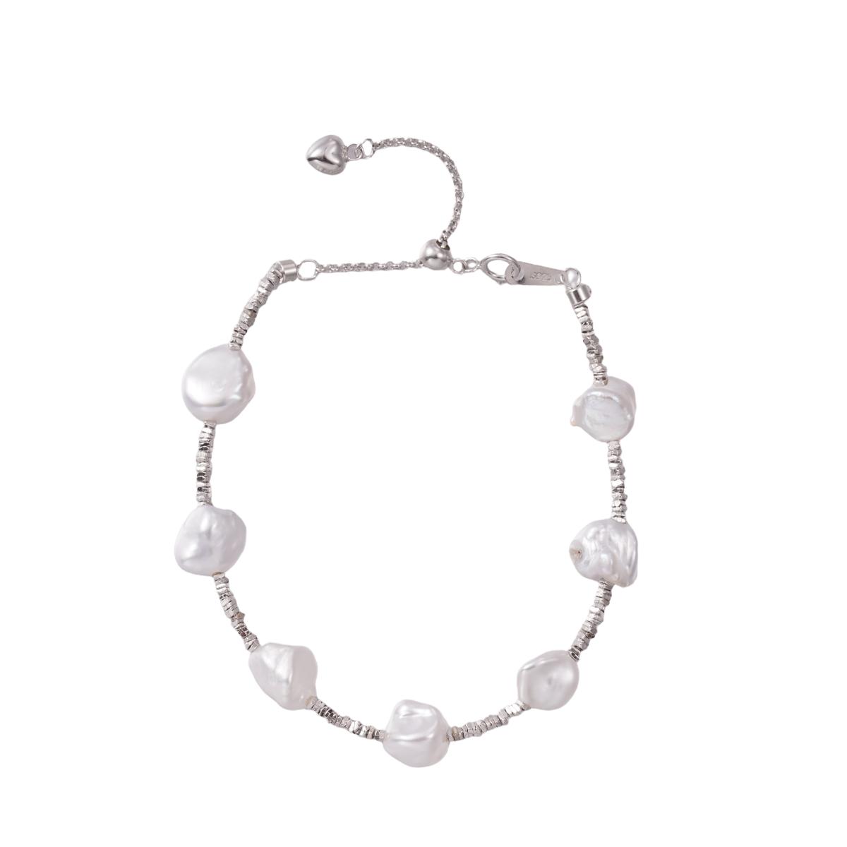 The bracelet features a delicate silver chain with a bright, lustrous finish. Irregularly shaped white natural freshwater pearls are spaced along the chain, each displaying a soft, warm glow and a plump, rounded form. The pearls vary slightly in size, embodying a classic Baroque-style aesthetic. One end of the bracelet is attached to an adjustable extender chain with a small heart-shaped charm, while the other end is equipped with a secure lobster clasp. Together, these allow for flexible length adjustment and reliable fastening.