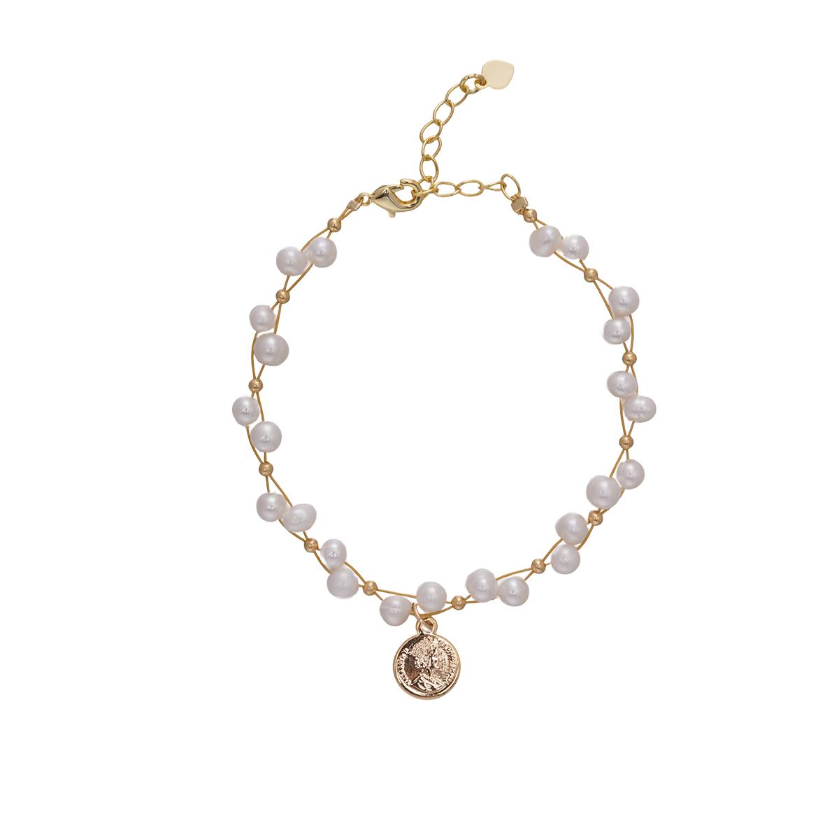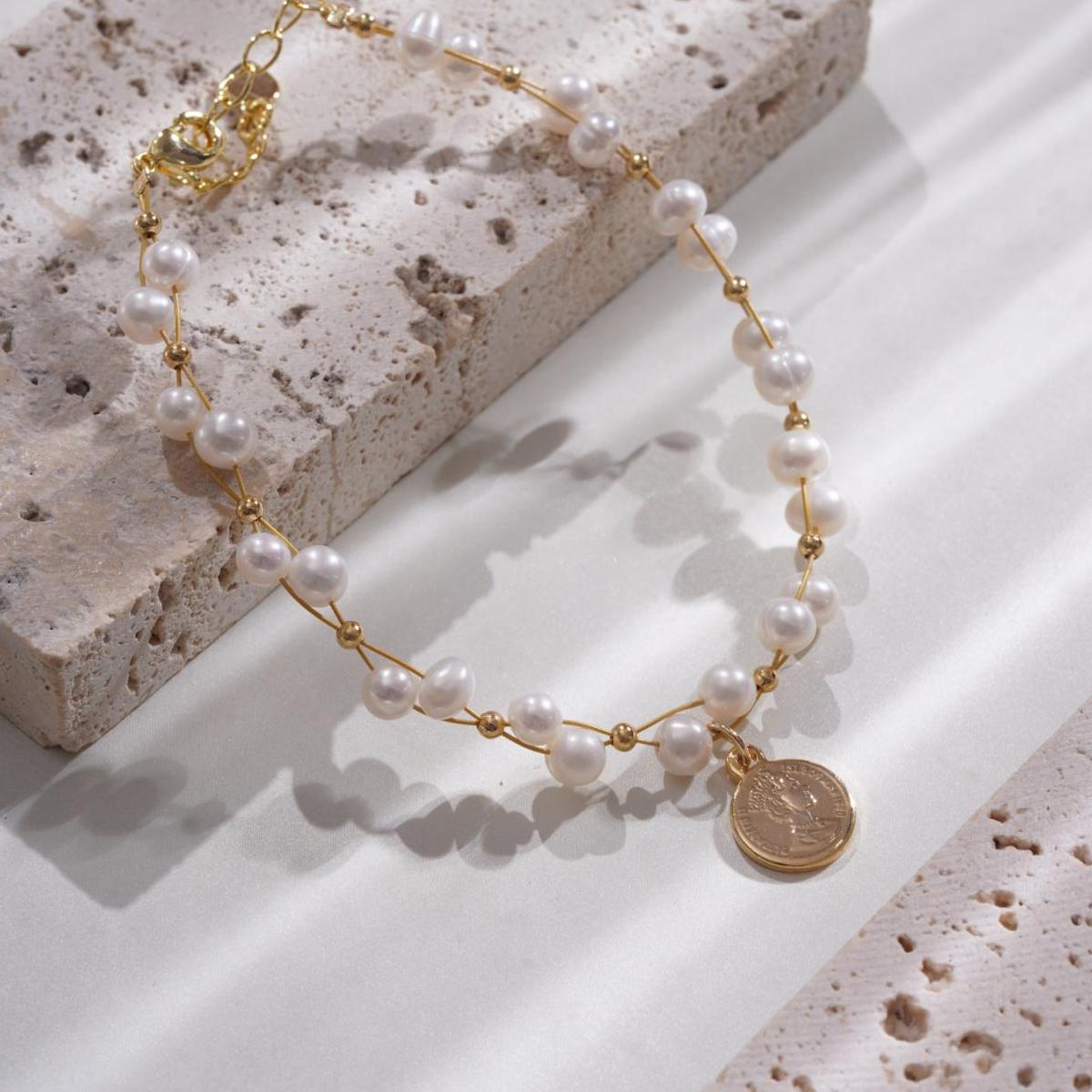 The combination of fine brass chains and warm, rounded freshwater pearls evokes a sense of refined sophistication. This blend of materials lends the bracelet exceptional versatility, effortlessly complementing cozy knitwear or structured outerwear. Its minimalist yet timeless design seamlessly transitions into professional work attire or casual everyday wear, exuding versatile elegance.