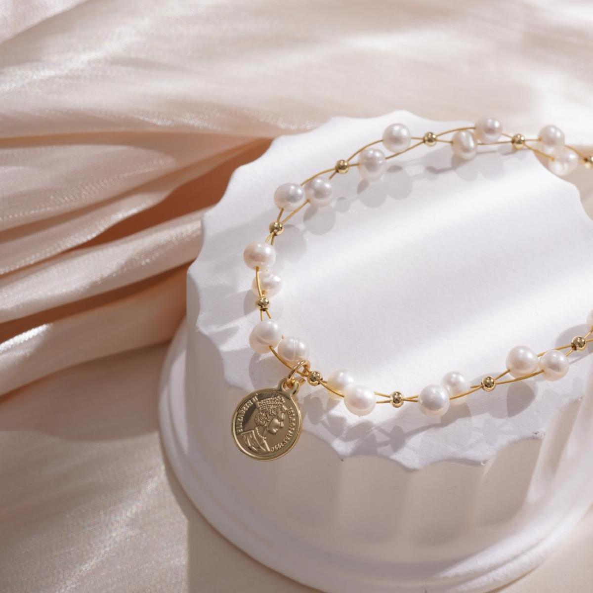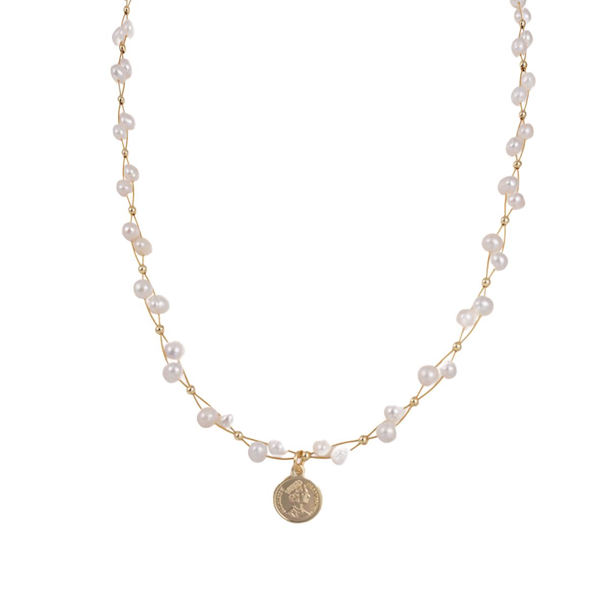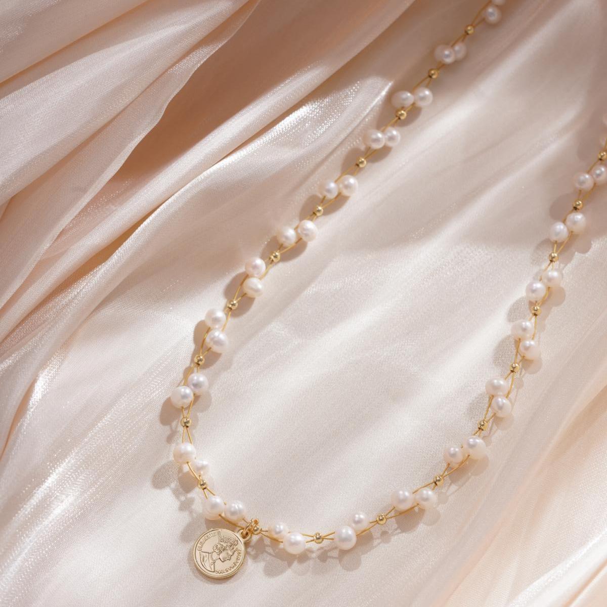 This necklace masterfully blends classic and contemporary elements. Its structure consists of two delicately braided gold-tone brass chains, meticulously interwoven at uniform intervals to create a layered textural pattern. Strung along these chains are rigorously selected natural freshwater pearls, each boasting a plump, perfectly rounded shape and flawlessly smooth surface that emits a soft, natural glow under light. Centered on the necklace is an exquisitely crafted gold-tone circular pendant featuring a finely engraved portrait with remarkable detail. The clasp is secured with a durable gold-tone lobster clasp and extension chain, enabling flexible length adjustments for a customized fit. A miniature heart-shaped charm adorns the chain end, adding a subtle touch of sophistication.
