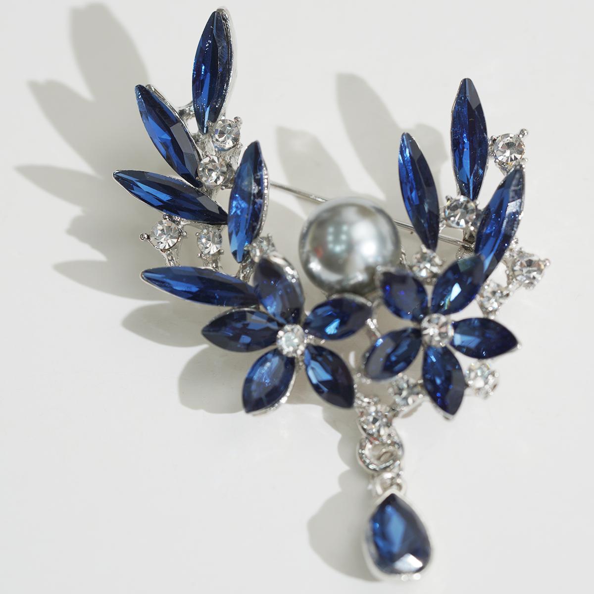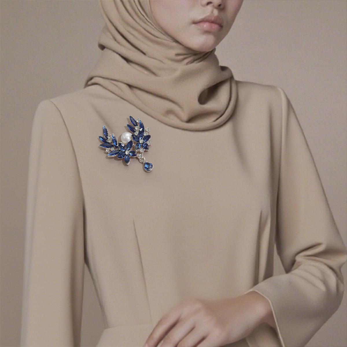 A vintage-inspired brooch blending floral and leaf motifs, highlighted by a lustrous pearl and sparkling crystals. A timeless piece to add sophistication to any look.