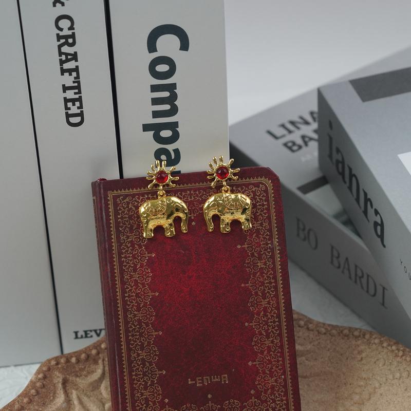 Crafted from gold-tone alloy. Features an upper sun motif with radiating line details and a central round red cubic zirconia stone. Suspended below by a circular link is a pendant elephant with dark linear spot textures on its body, designed with rounded contours.