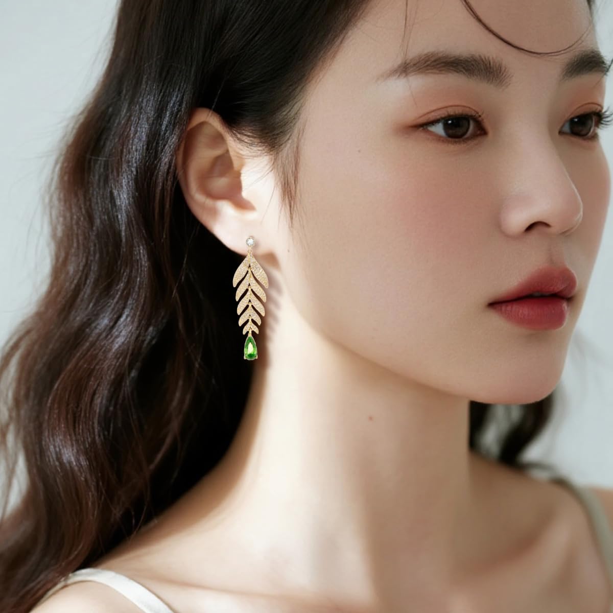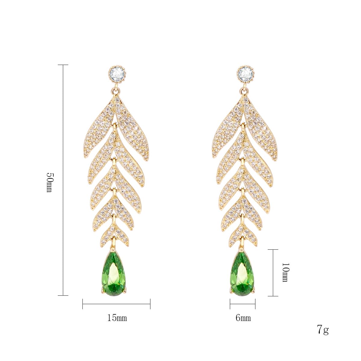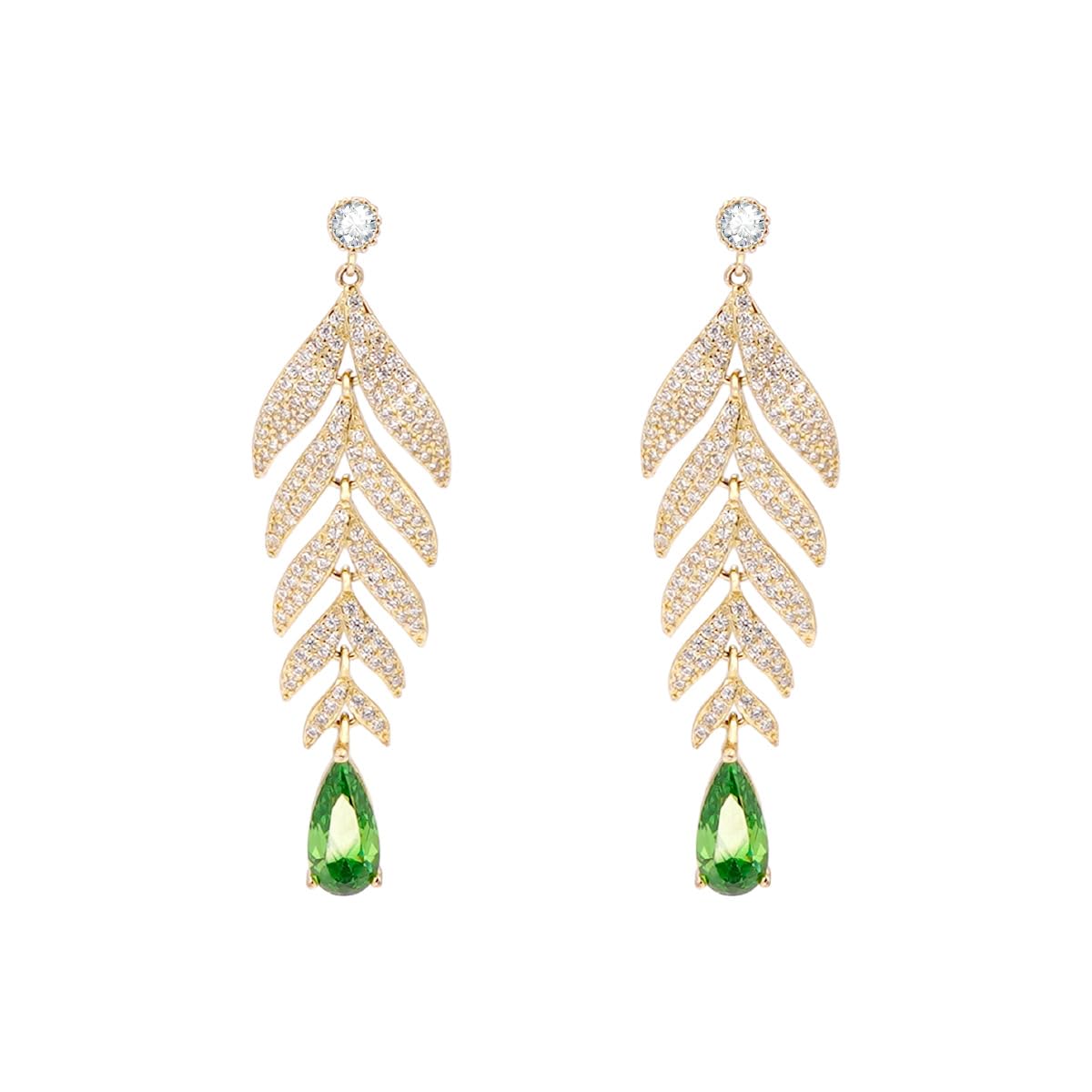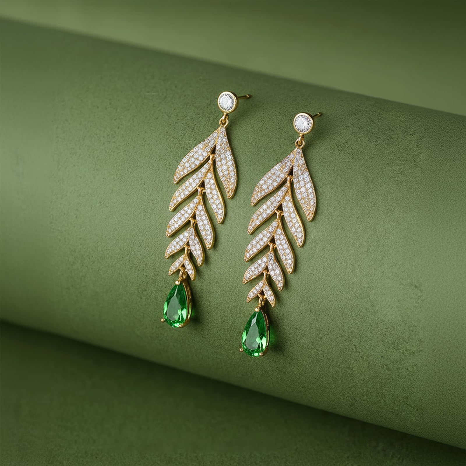 Inspired by tropical banana leaves, these exquisite earrings feature a cascading 5-tier design with gold-plated leaves pavé-set with brilliant zircons, culminating in a vibrant green teardrop zirconia drop. Crafted in hypoallergenic 14K gold plated sterling silver, they combine dynamic movement with luxurious comfort. The harmonious blend of gold, clear zircons, and green accents evokes tropical abundance, making them perfect for resort wear or special occasions. Presented in premium gift packaging, they are an ideal present for nature lovers and fashion enthusiasts.