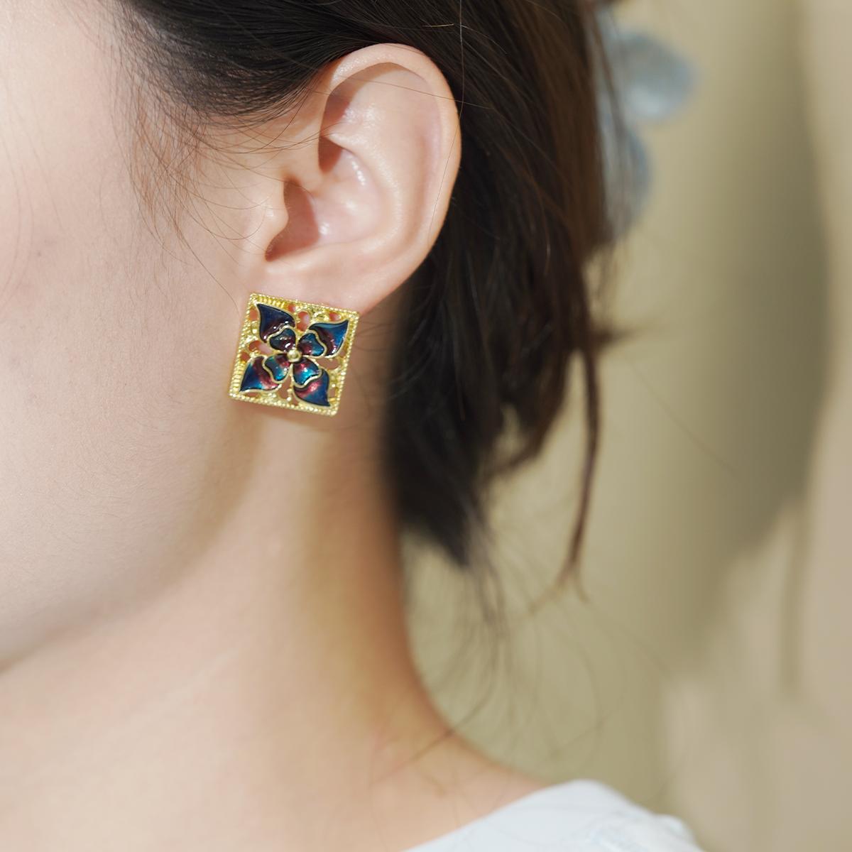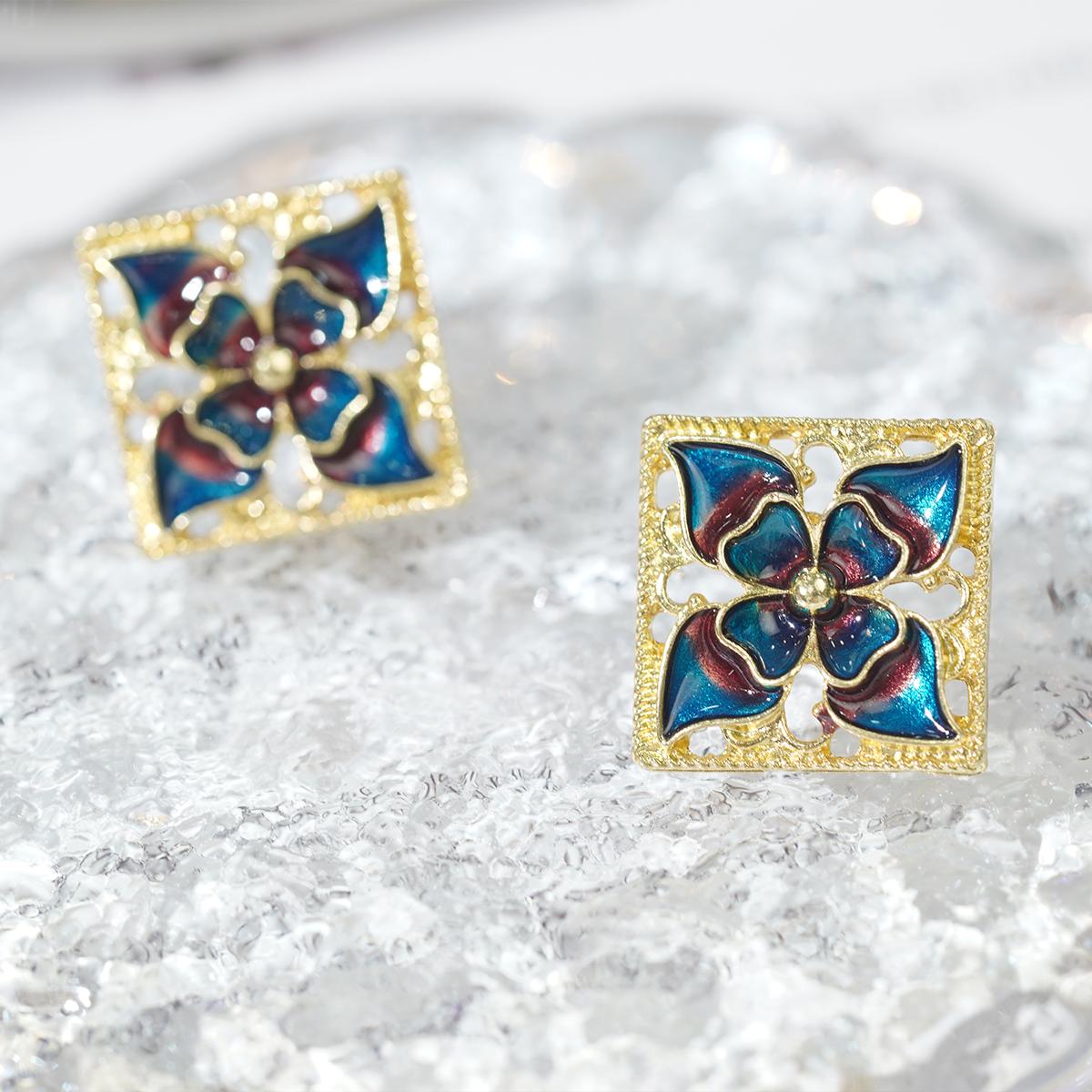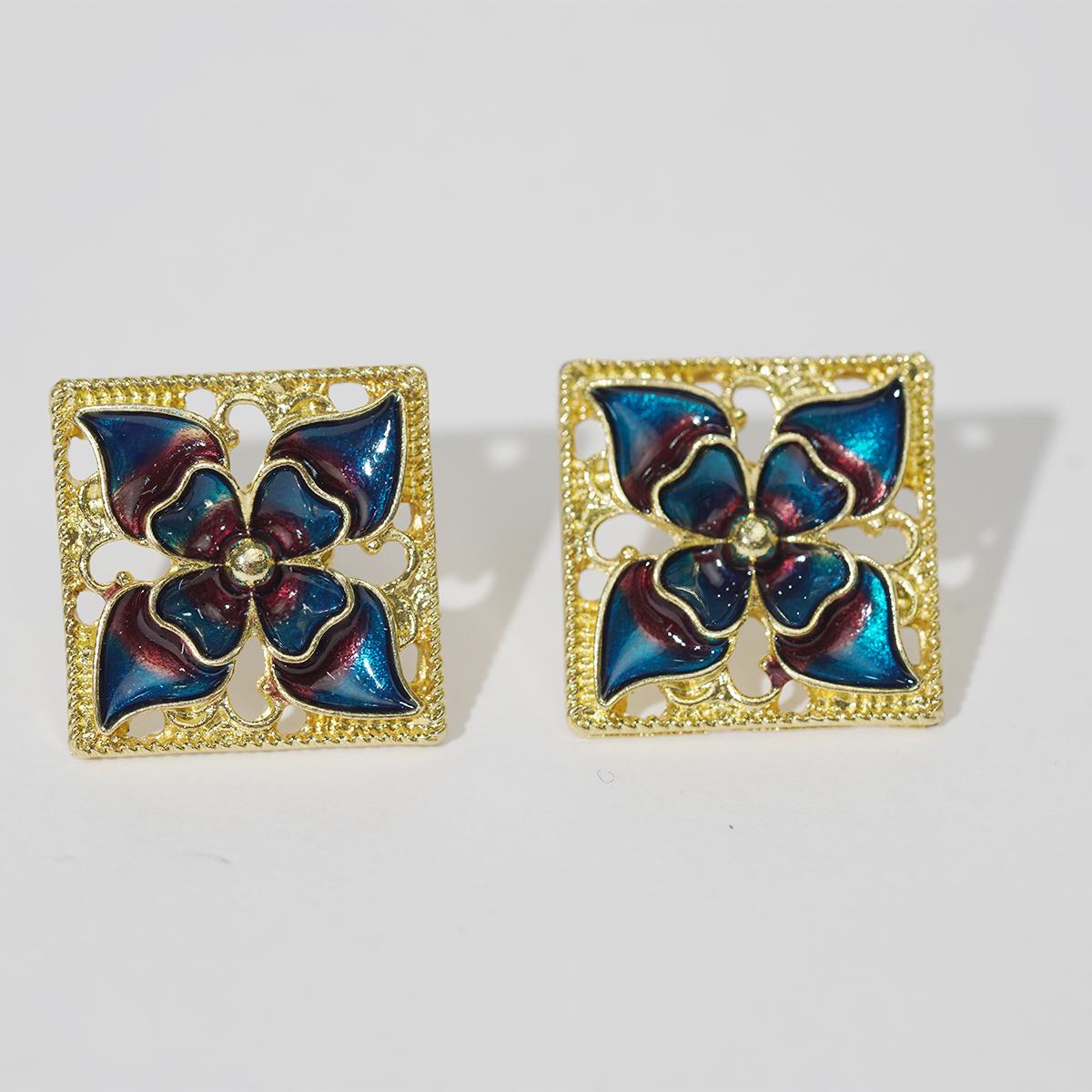 Crafted from gold - toned alloy, the earrings boast delicate filigree borders. At the center, a four - petal flower showcases blue - purple gradient enamel, creating a rich, colorful effect.