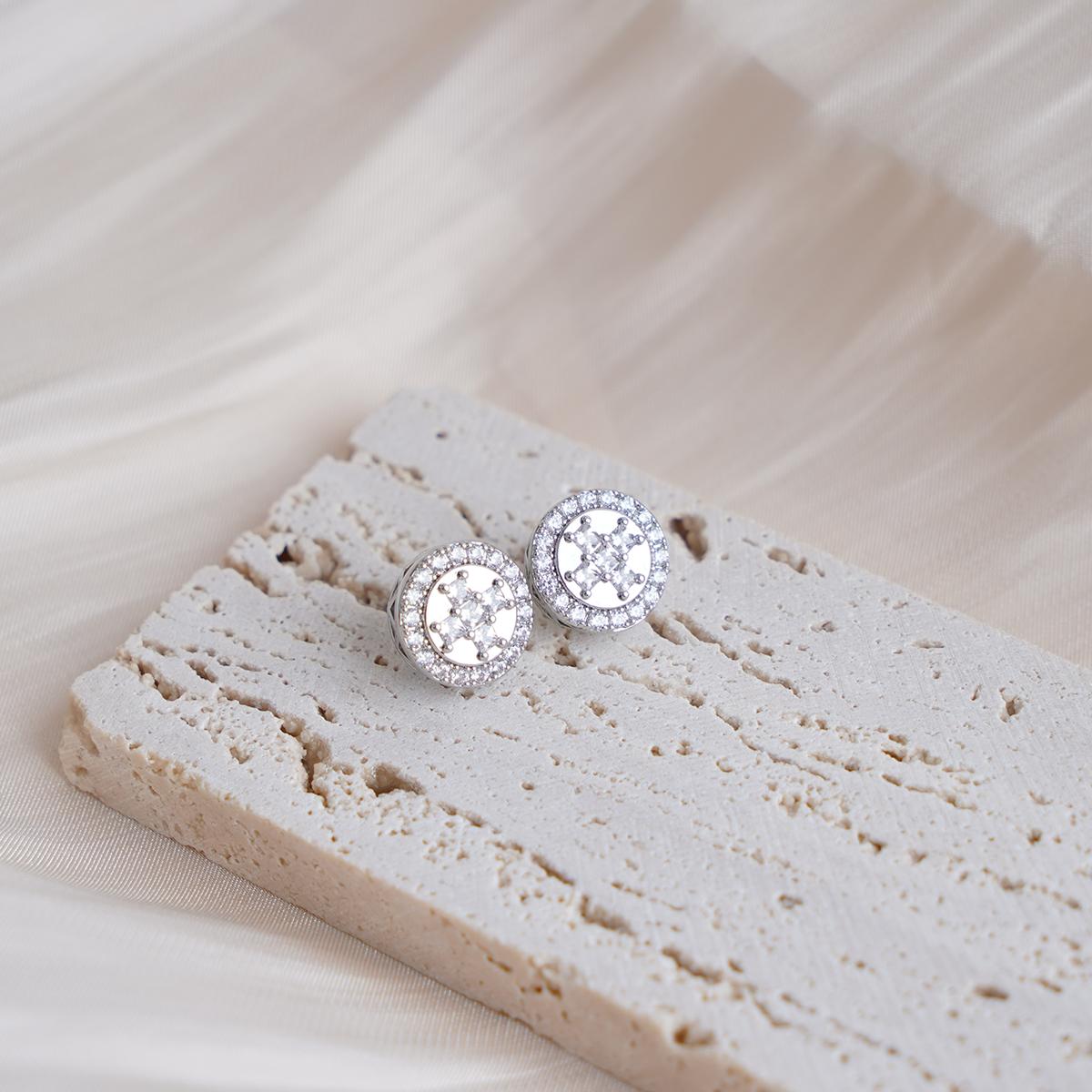 Crafted from gold or silver-tone copper, these symmetrical stud earrings feature a circular face with a central cluster of baguette-cut zirconia stones arranged in a cross pattern, surrounded by a halo of meticulously set round zirconia stones. The double-layer setting creates dimensional sparkle and visual depth. Geometric openwork patterns adorn the sides, adding architectural detail while maintaining a lightweight structure. The post is slender and secure for comfortable wear.