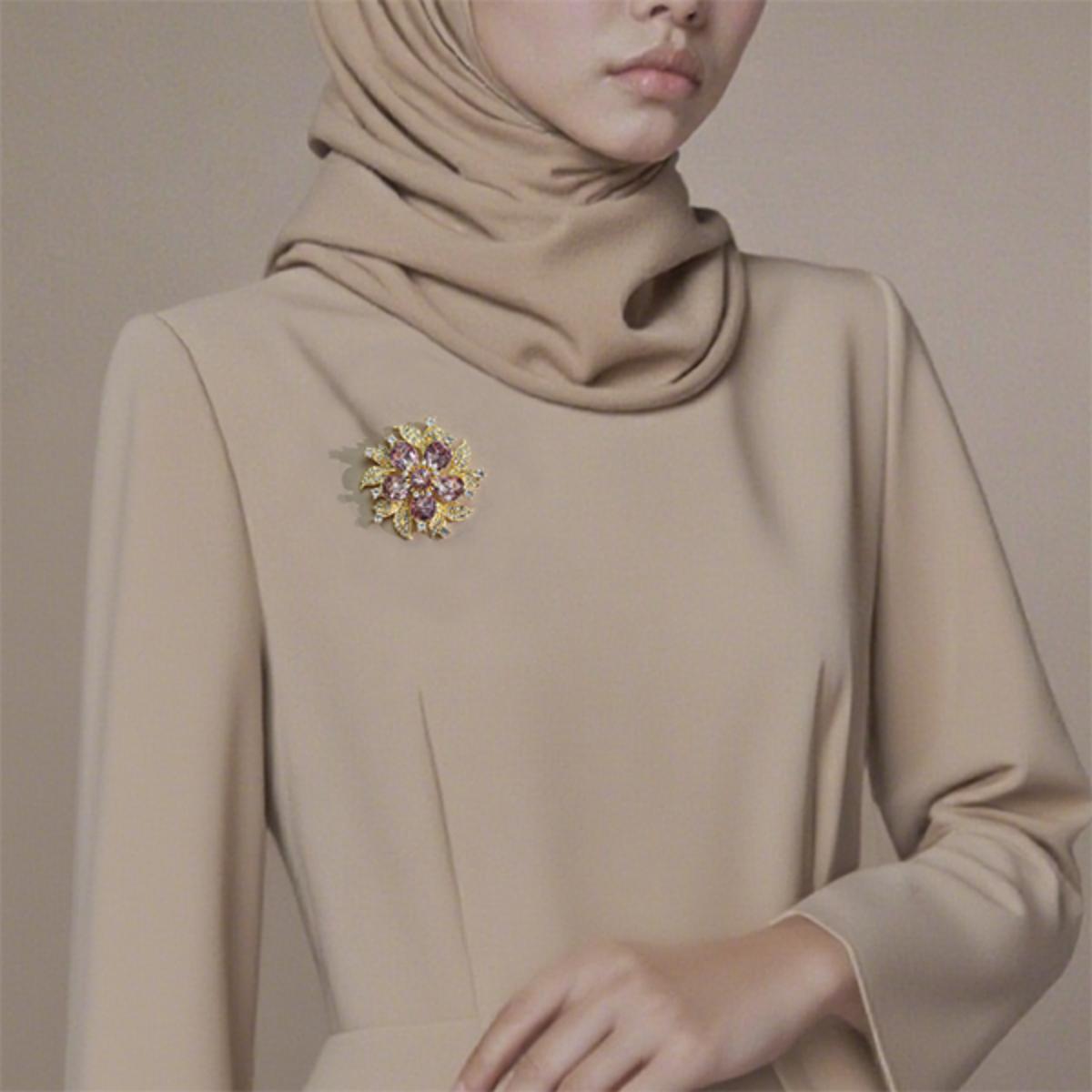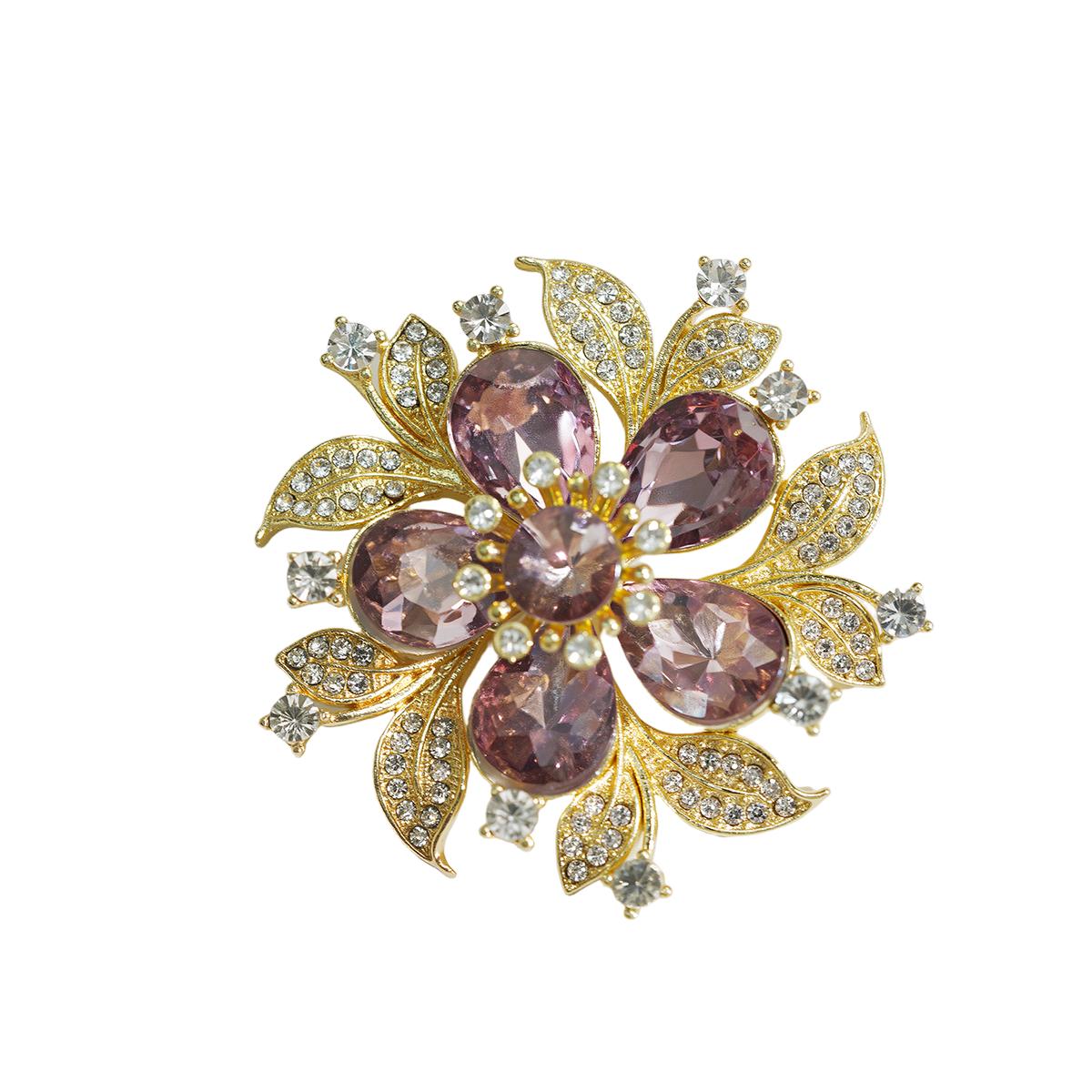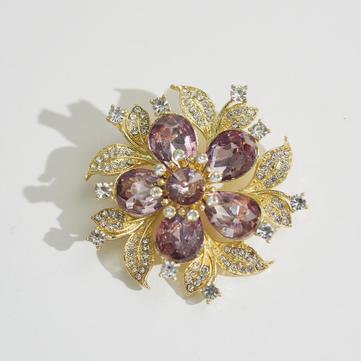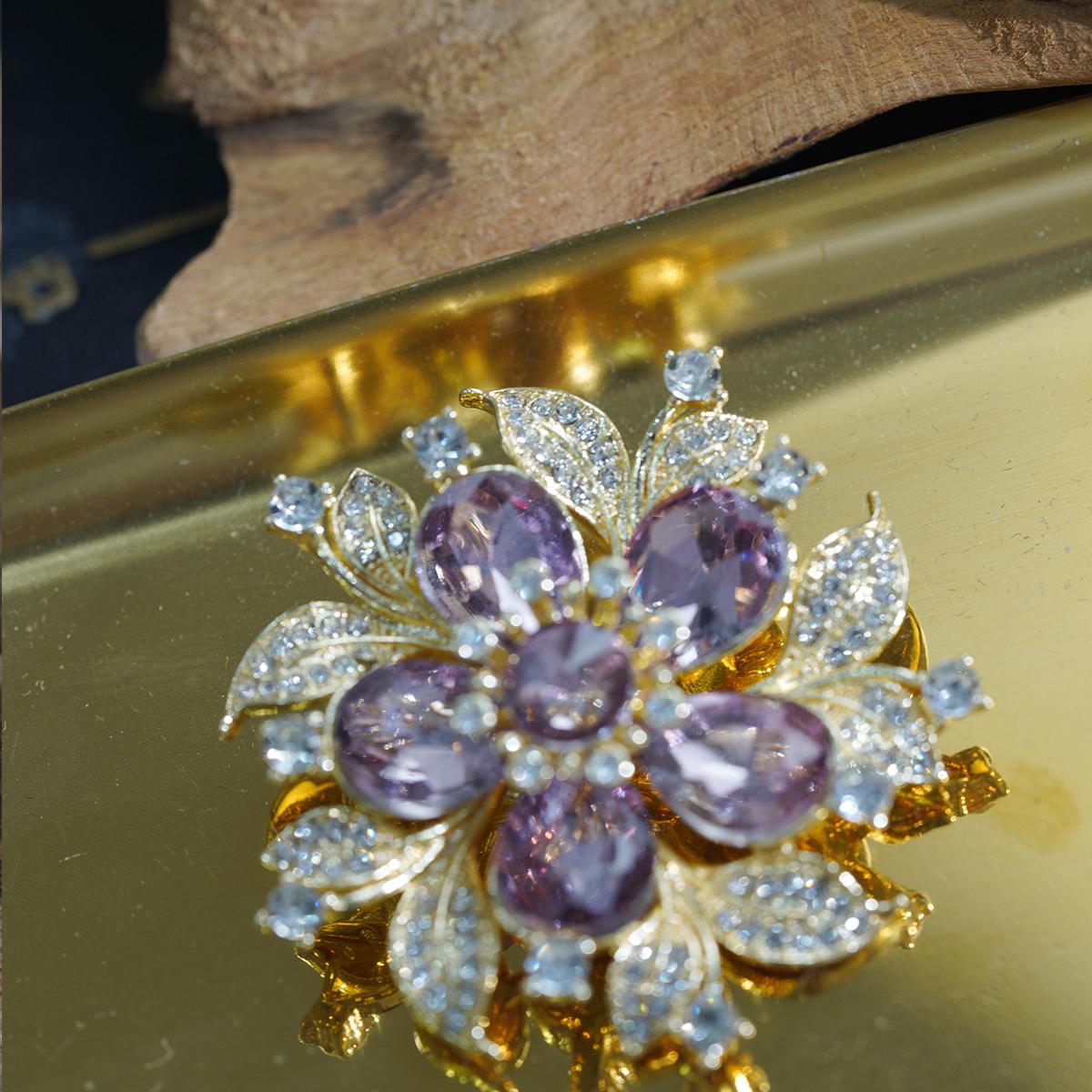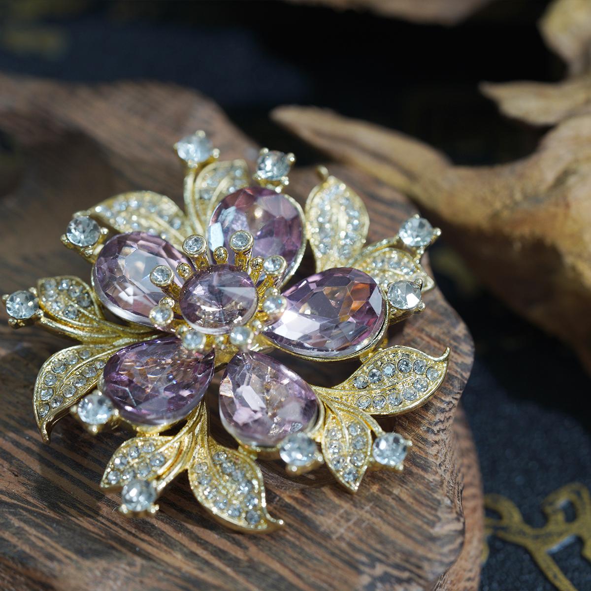 Women's Floral Brooch with Purple Zircon Bloom, Glitter Leaves for Elegant Events