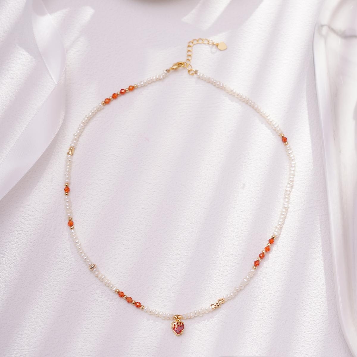 The necklace is composed of multiple round white natural freshwater pearls, each emitting a soft creamy luster. Between the pearls, vibrant orange-red crystal beads and golden brass beads are interspersed, with all spacer beads finely polished to achieve a smooth and bright texture. A heart-shaped pendant hangs at the center of the bottom, featuring an orange-red crystal securely set within a golden brass frame using a prong-setting technique. All beads are strung on a brass chain that exhibits a warm golden shine. The overall design forms an elegant U-shaped drape with fluid and natural lines.