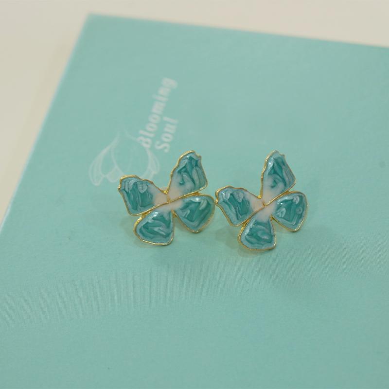 These symmetrical butterfly stud earrings feature blue-white gradient enamel wings with ink-wash textured details, set on an alloy base and framed by gold-trimmed edges for refined definition.