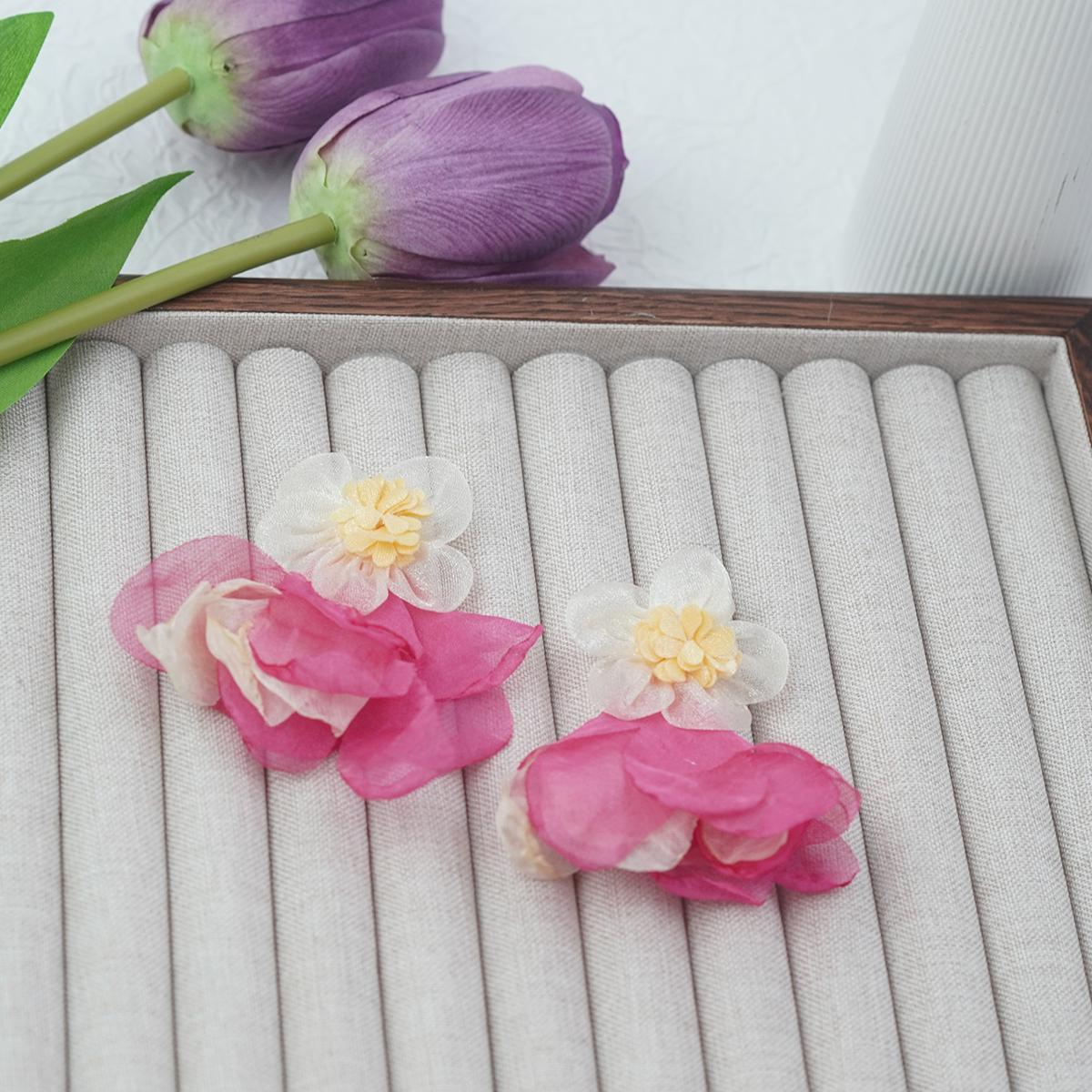 Design & Materials: These earrings feature pink - white fabric flowers. Lightweight, semi - transparent cloth forms petals with natural folds and soft hues. Yellow cloth stamens are in the center. Made by gluing and sewing, the craftsmanship focuses on recreating natural flower shapes, blending cloth’s lightness and handmade charm.