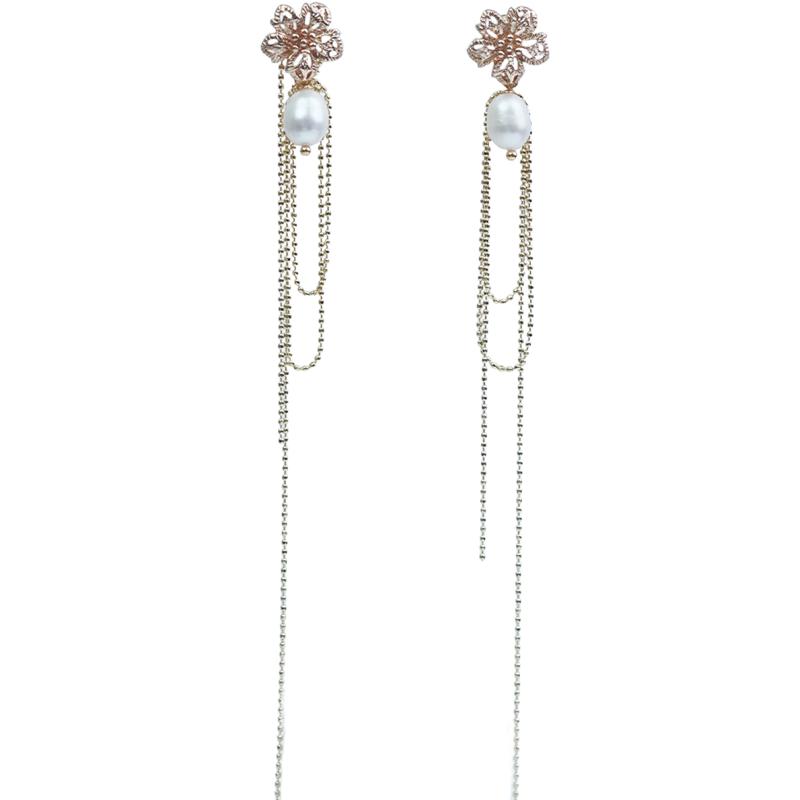 Hand-assembled petal clusters feature multi-layer gold-tone alloy with artisanal openwork. Centerpiece natural freshwater pearl radiates soft luminosity against textured petals. Three graduated bead chains descend in asymmetrical drape—dual shorter outer strands flanking a central longer strand—all interlinked with precision-calibrated micro beads.