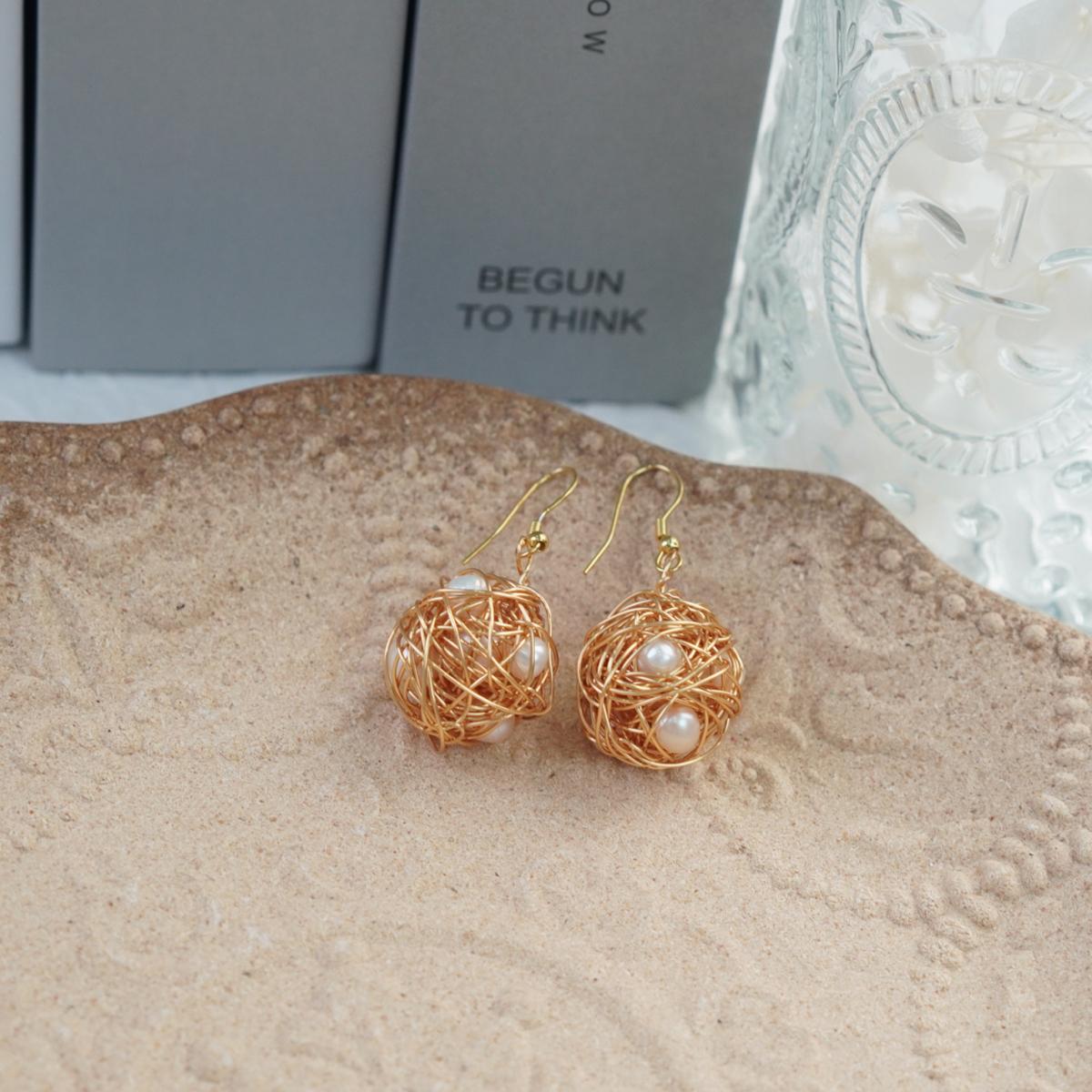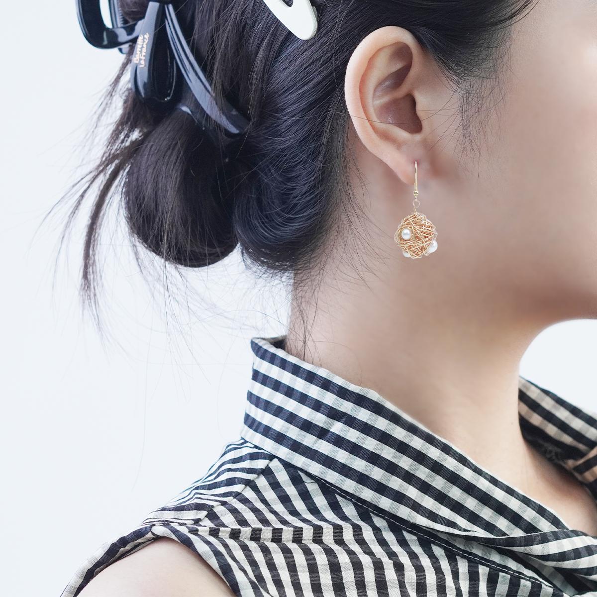 Design & Materials:Inspired by natural bird nests, these earrings use copper - plated 18K gold wires. The wires are twisted to copy the nest’s random, organic form. Pearls, like eggs in a nest, are asymmetrically placed for a lively, creative appearance.
