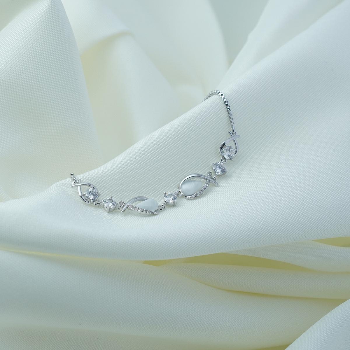 Elegant Silver-Tone Bracelet with Cat's Eye & Zircon Stones, Adjustable Chain, Luxury Jewelry Gift for Women