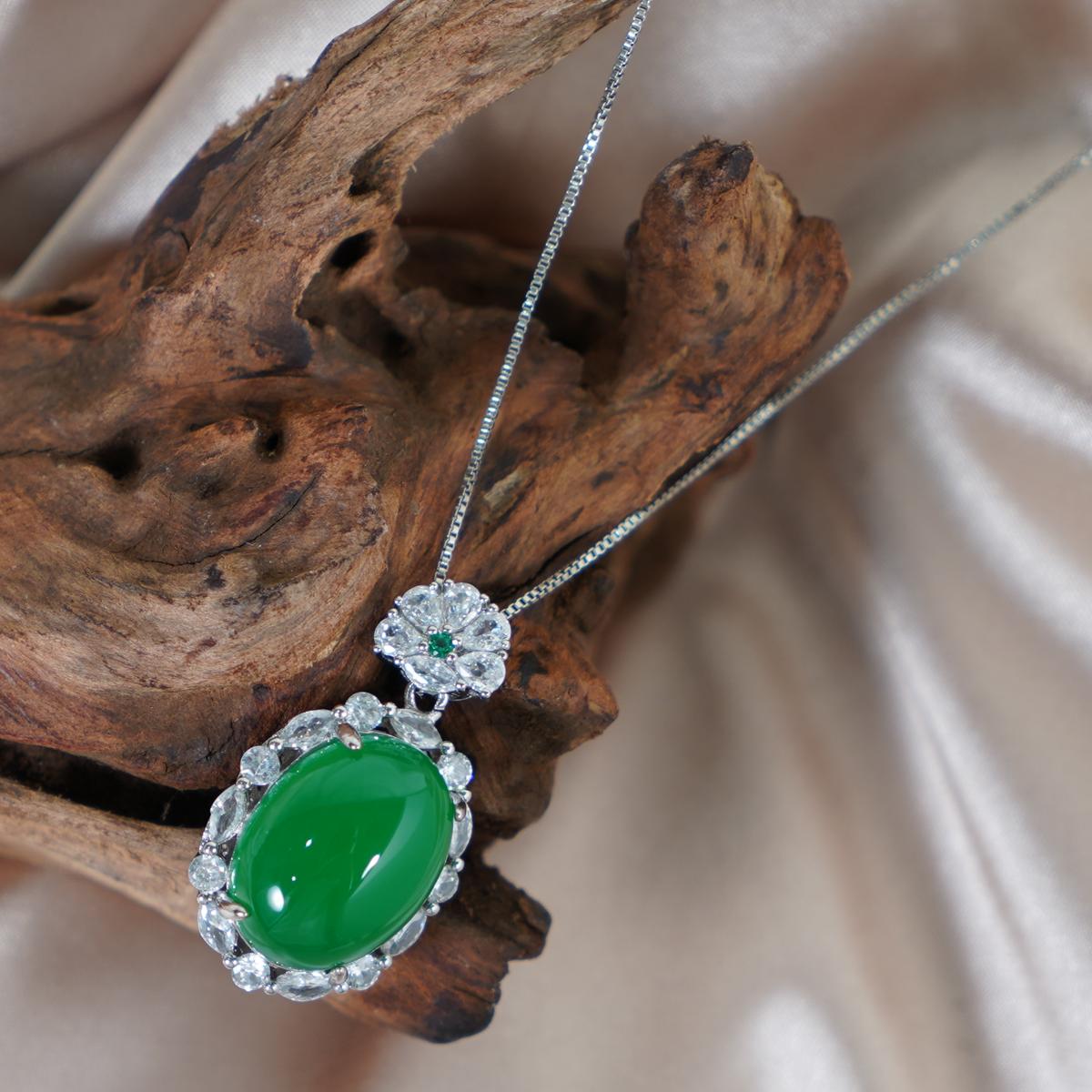 Design & Materials: The pendant centers on an oval-cut green chalcedony stone, showcasing uniform, rich color...