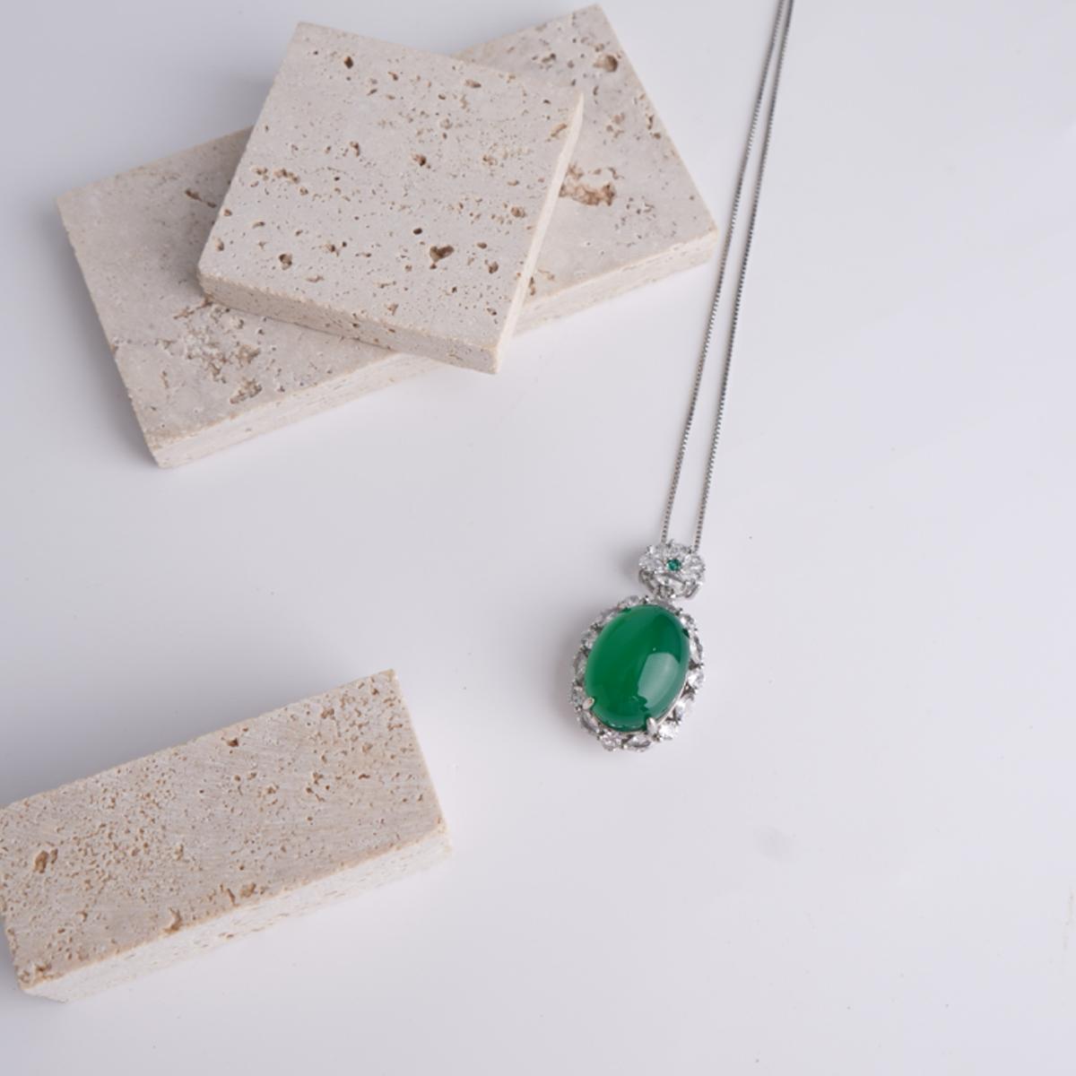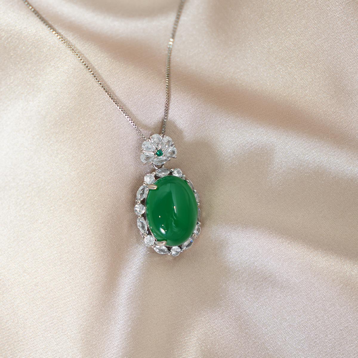 The oval green chalcedony exhibits a fresh, translucent hue with consistent color distribution.  The dual-accent design (top green stone + zircon frame) enhances visual depth without overwhelming the piece. Crafted with precision, the delicate chain balances the pendant proportionally, ensuring a lightweight, comfortable feel. Zircons are secured via prong settings for durability and lasting sparkle.