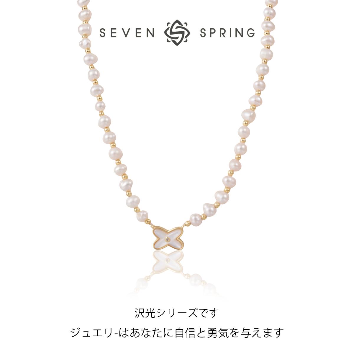 The white pearls exhibit a smooth, warm luster with consistent surface quality. Brass components—including beads and the pendant frame—are finely finished with clear contours and no rough edges. The beige shell displays subtle natural textures and is securely set within the metal frame. The alternating pearl-and-bead design enhances visual rhythm, while the clover pendant offers a modern silhouette softened by organic shell elements. The central brass bead adds refined detail, and the overall soft tone harmonizes pearl warmth with metallic brilliance.