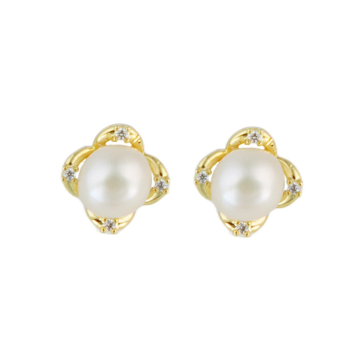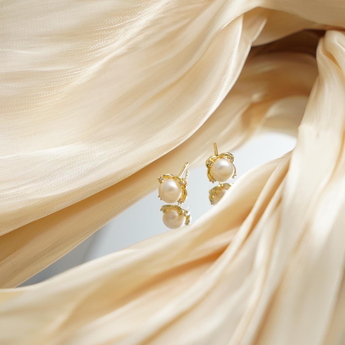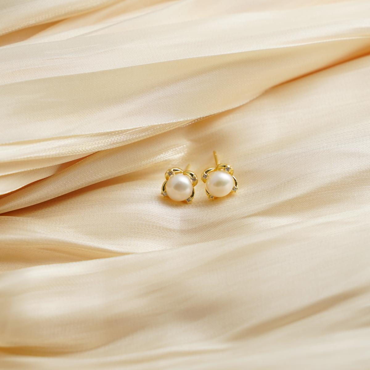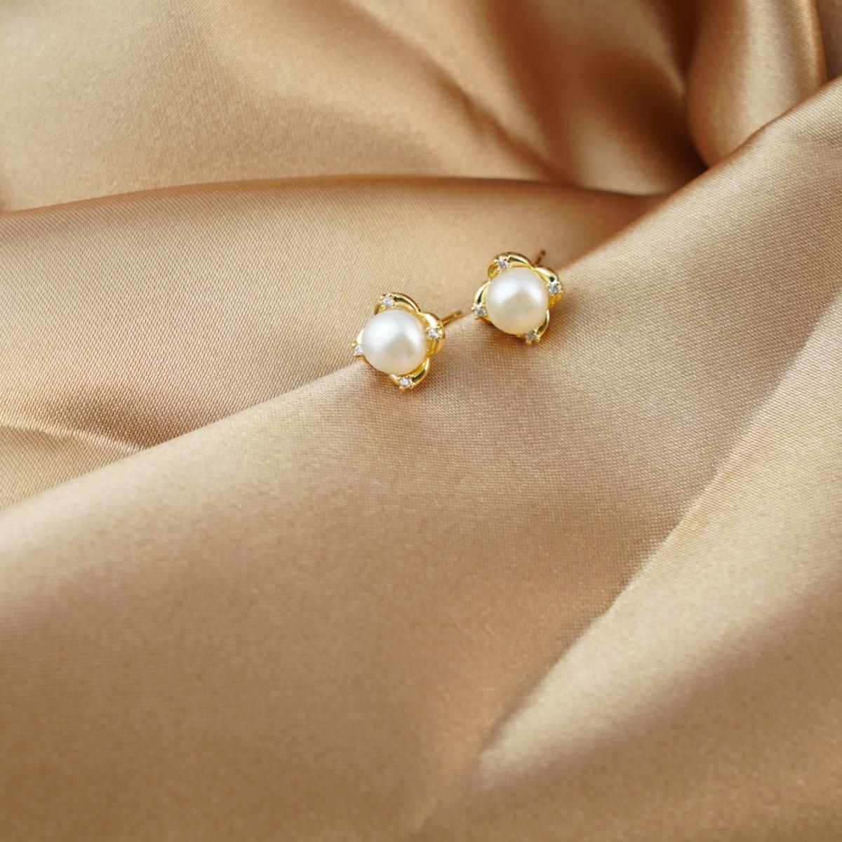 The earrings feature a round white natural freshwater pearl at the center, which emits a soft, creamy luster and exhibits a naturally warm and smooth texture. The pearl is secured by a golden alloy setting designed in a floral motif, with each petal tip adorned by a transparent zircon. The zircons are clearly cut, refracting brilliant sparkle. The metal components showcase a bright golden finish with even and fine luster, creating a pleasing contrast with the pearl's gentle glow. The ear pins are made of silver, offering excellent wearability and providing reliable protection for those with sensitive skin.